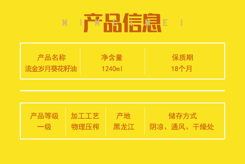 商品属性 [供应商] 深圳市怡亚通供应链股份有限公司 [品牌:] 米妹妹(MIMEIMEI) [型号:] 流金岁月葵花籽油 [规格:] 248ml/瓶 5瓶/盒