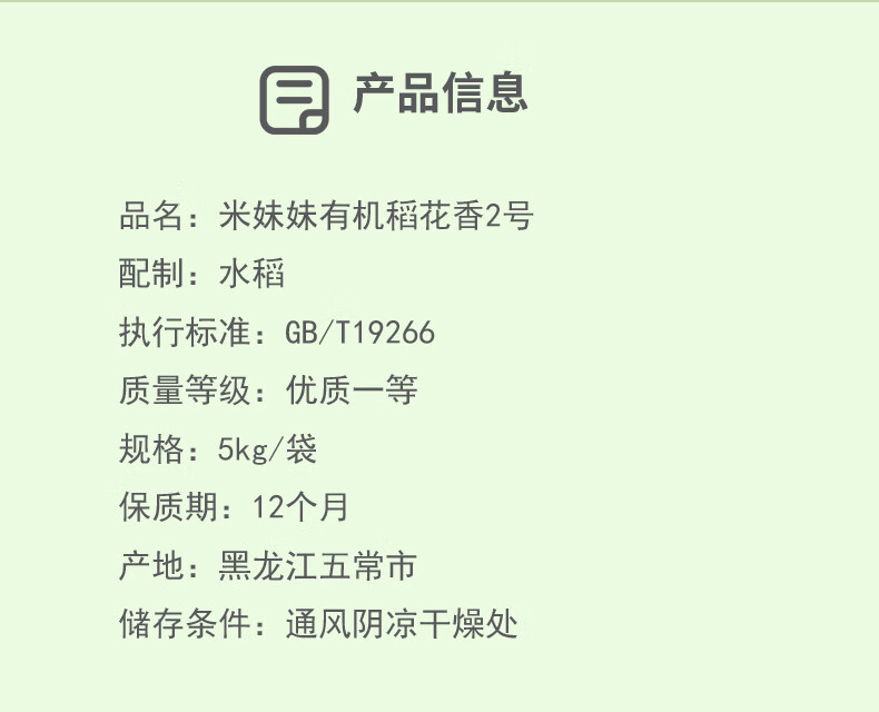 商品属性 [供应商] 德致商成集团有限公司 [等级] 一级 [商品毛重] 5.0kg [是否有机] 有机 [米种] 稻花香 [包装形式] 袋装 [国产/进口] 国产 [净含量] 5kg [保质期] 12个月 [原料产地] 黑龙江 [是否真空包装] 真空包装 [商品产地] 中国大陆