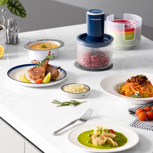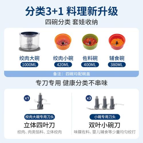 商品属性 [供应商] 上海邮乐网络技术有限公司 [属性名称] 属性值 [名称] 摩飞套娃料理机(食物处理器) [型号] MR9405 [额定电压] 220V/50Hz [功率] 180W [尺寸] 134*134*283mm [容量] 玻璃碗1000mL、辅食碗380mL、佐料碗400m绞肉碗420mL