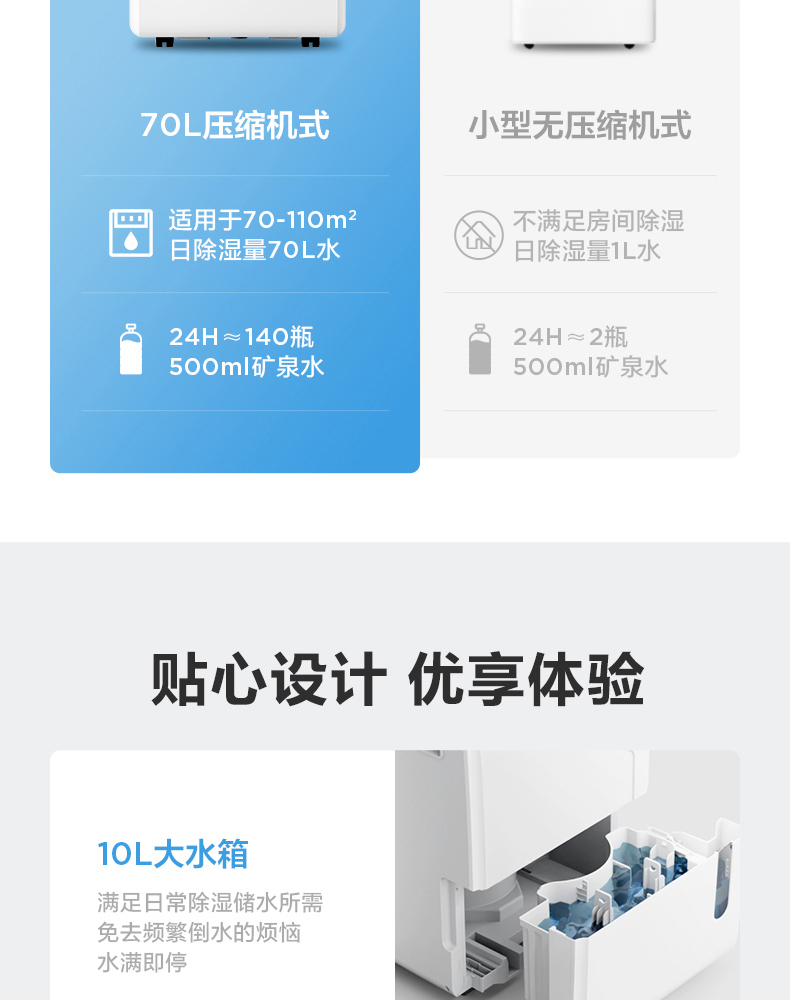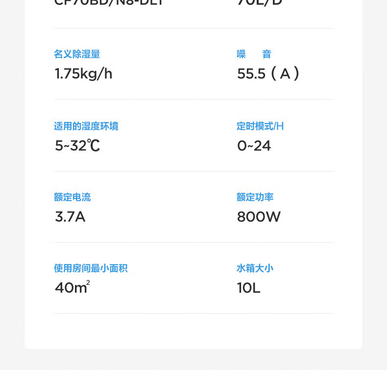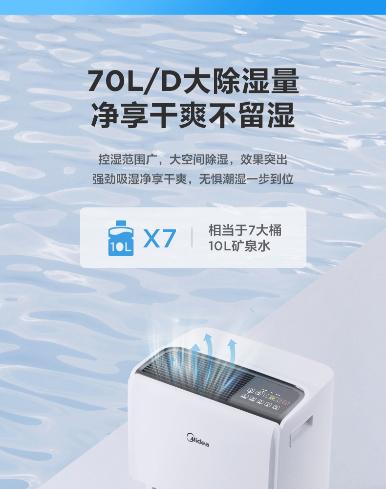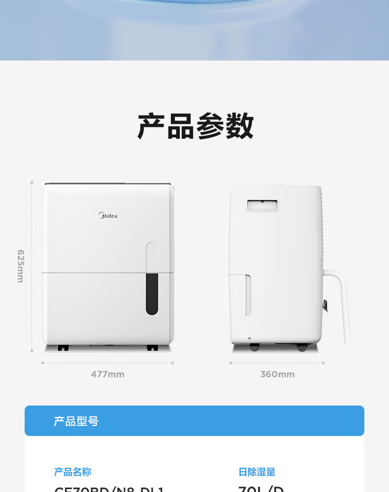 商品属性 [供应商] 科力普科技集团股份有限公司 [除湿机_额定电压] 220V [除湿机_除湿量] 70L/D [除湿机_产品尺寸] 长477mm;宽360mm;高625mm [除湿机_适用面积] 约70-110㎡ [除湿机_额定功率] 800W [除湿机_产品重量] 13.35kg [品牌] 美的 [型号] CF70BD/N8-DL1