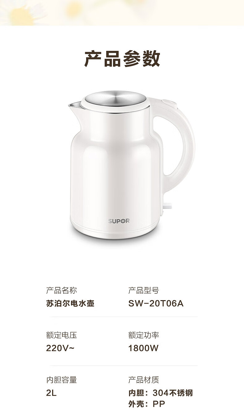 商品属性 [供应商] 深圳市云中鹤科技股份有限公司 [品牌名称:] 苏泊尔(SUPOR) [商品型号:] SW-20T06A [商品sku编码:] 1125899909013342 [重量:] 1.20kg [产地:] 绍兴 [单位:] 台