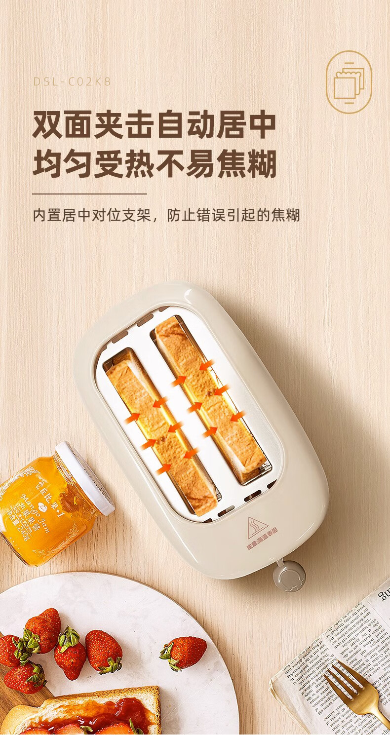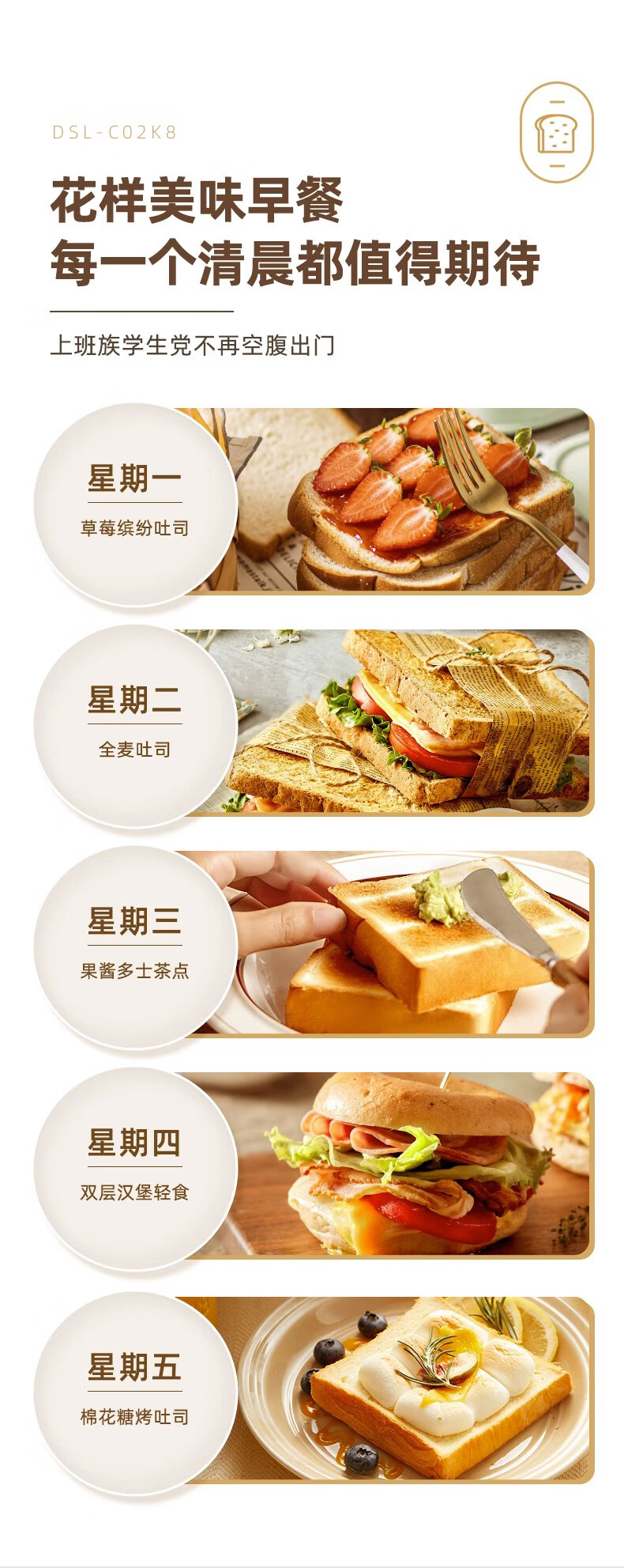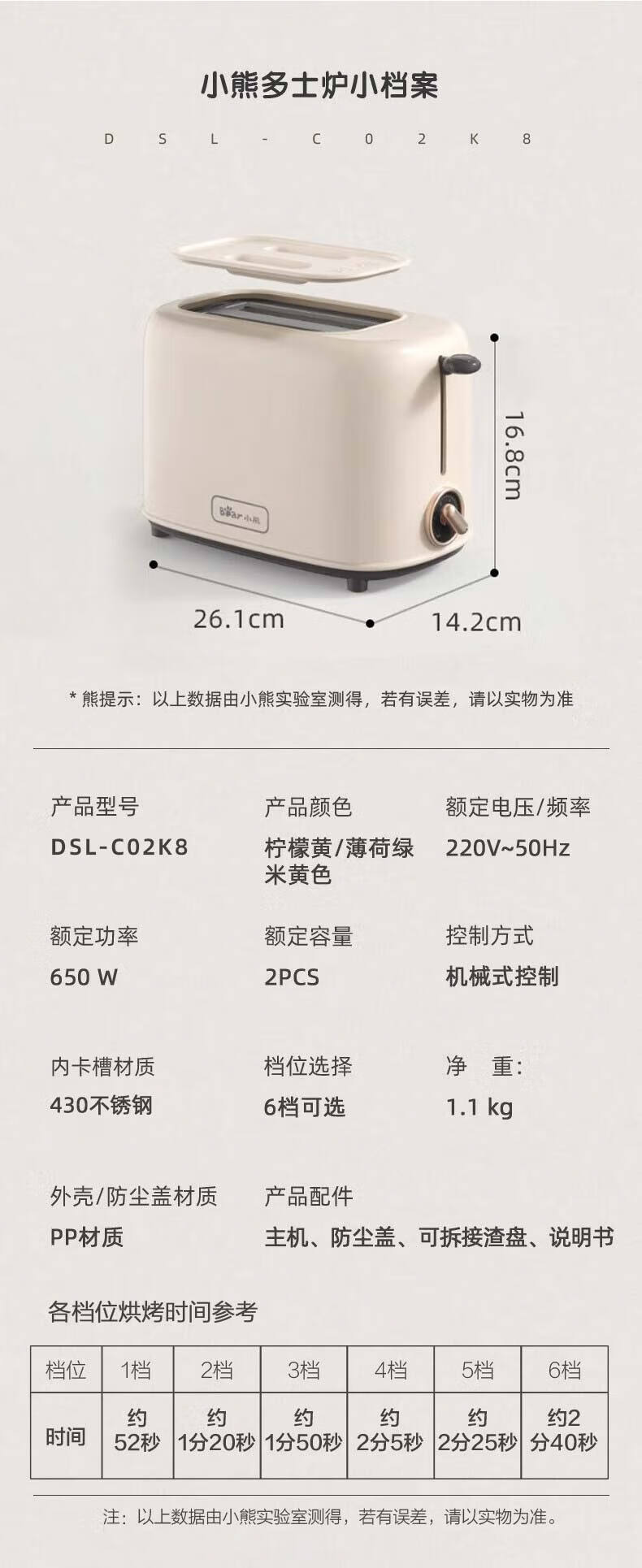 商品属性 [供应商] 德致商成集团有限公司 [加热方式] 双面加热 [清洗方式] 不可拆洗 [商品毛重] 500g [功率] 1000W以下 [操控方式] 机械式 [额定功率] 650W [国产/进口] 国产 [CCC强制性认证] 是 [火力调节] 可调节 [产品净重] 1.1kg [商品产地] 中国 [烤盘材质] 铝合金 [产品尺寸] 长261mm;宽142mm;高168mm [功能] 定时 [额定电压] 220V [烘烤档位] 6档 [认证型号] DSL-C02K8 [额定频率] 50Hz [烤盘类型] 多士炉 [烤盘直径] 25cm以下 [类别] 多士炉