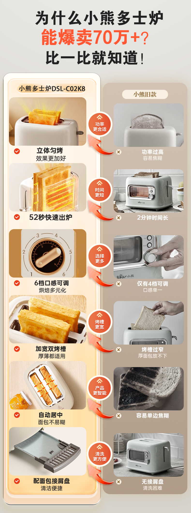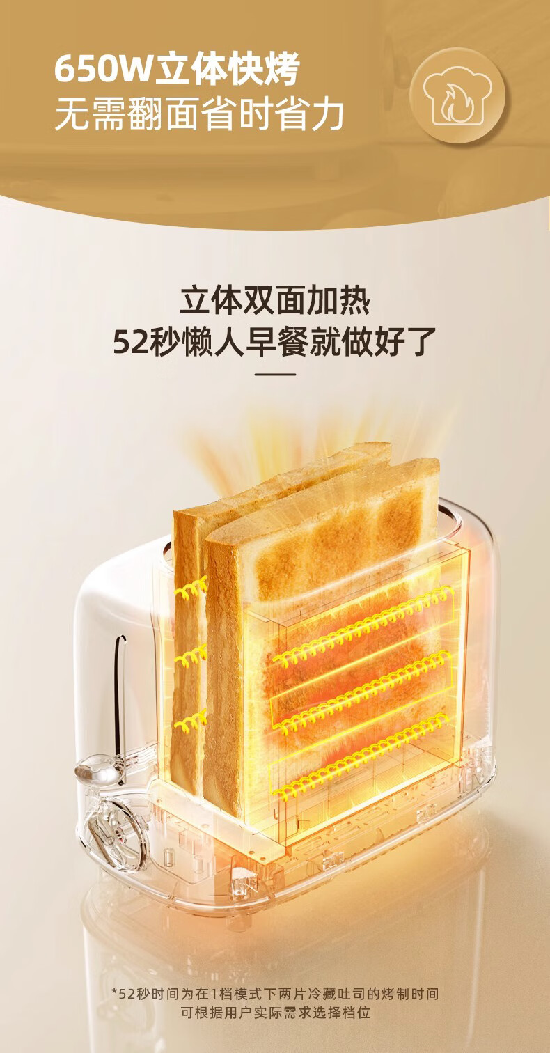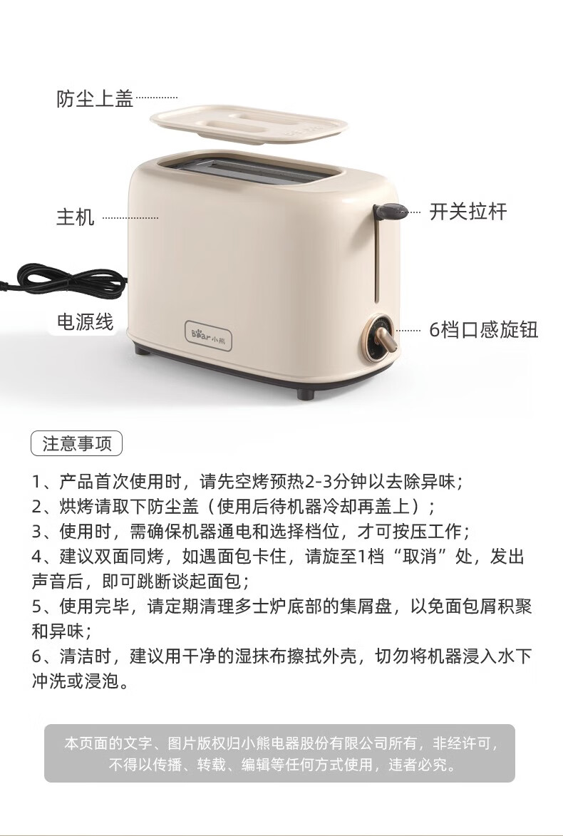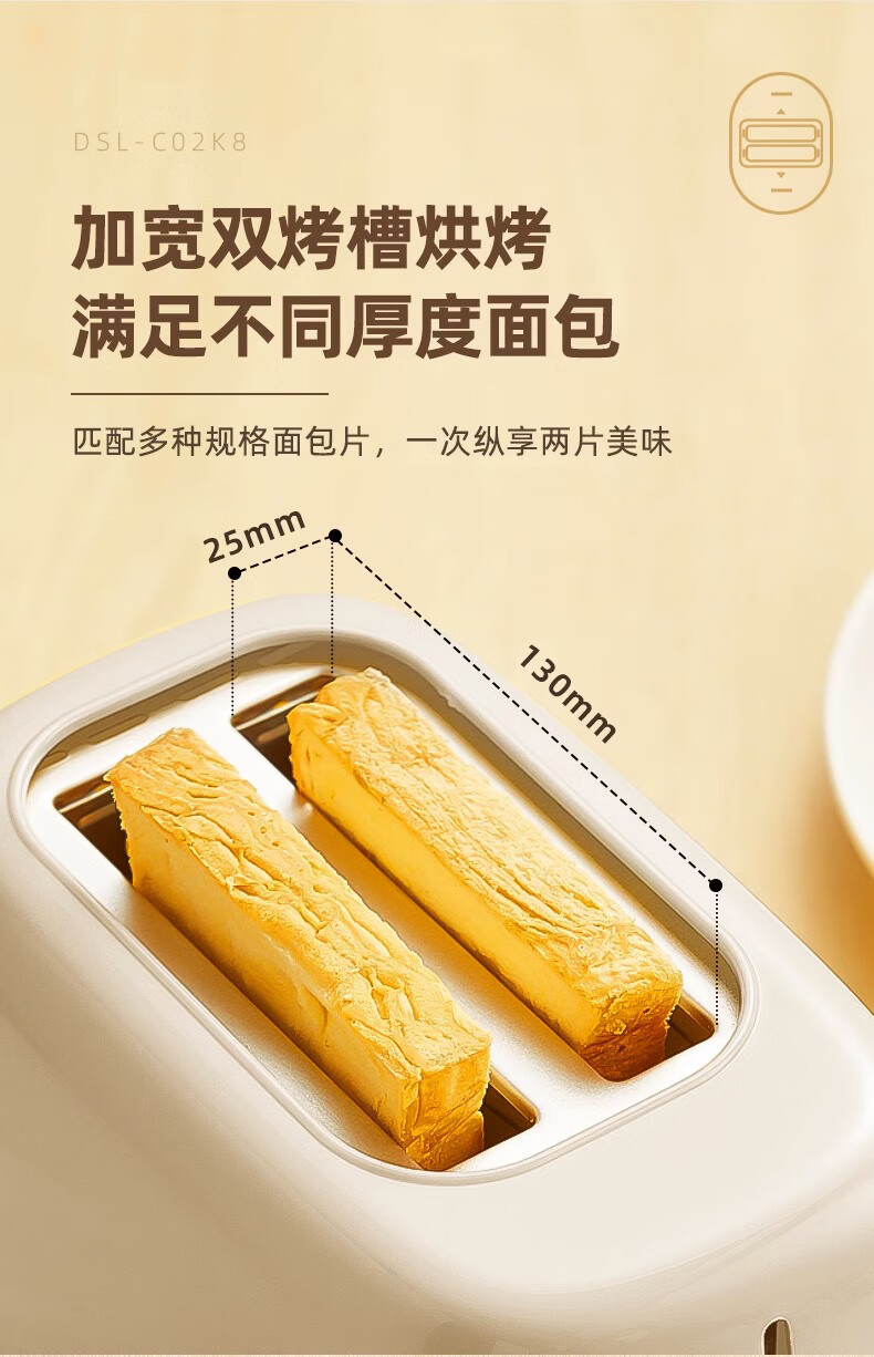 商品属性 [供应商] 德致商成集团有限公司 [加热方式] 双面加热 [清洗方式] 不可拆洗 [商品毛重] 500g [功率] 1000W以下 [操控方式] 机械式 [额定功率] 650W [国产/进口] 国产 [CCC强制性认证] 是 [火力调节] 可调节 [产品净重] 1.1kg [商品产地] 中国 [烤盘材质] 铝合金 [产品尺寸] 长261mm;宽142mm;高168mm [功能] 定时 [额定电压] 220V [烘烤档位] 6档 [认证型号] DSL-C02K8 [额定频率] 50Hz [烤盘类型] 多士炉 [烤盘直径] 25cm以下 [类别] 多士炉