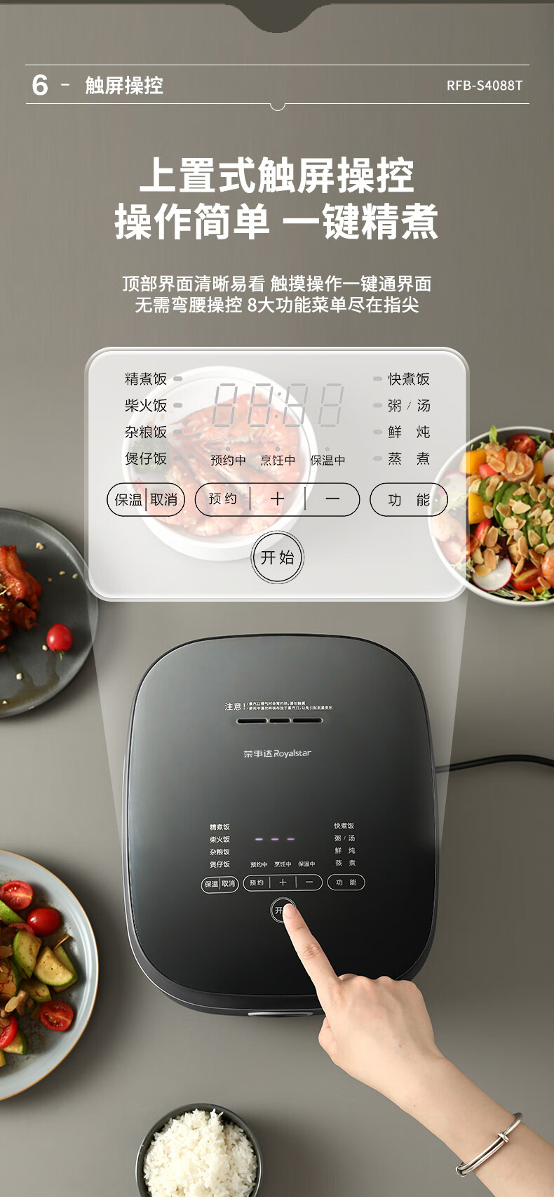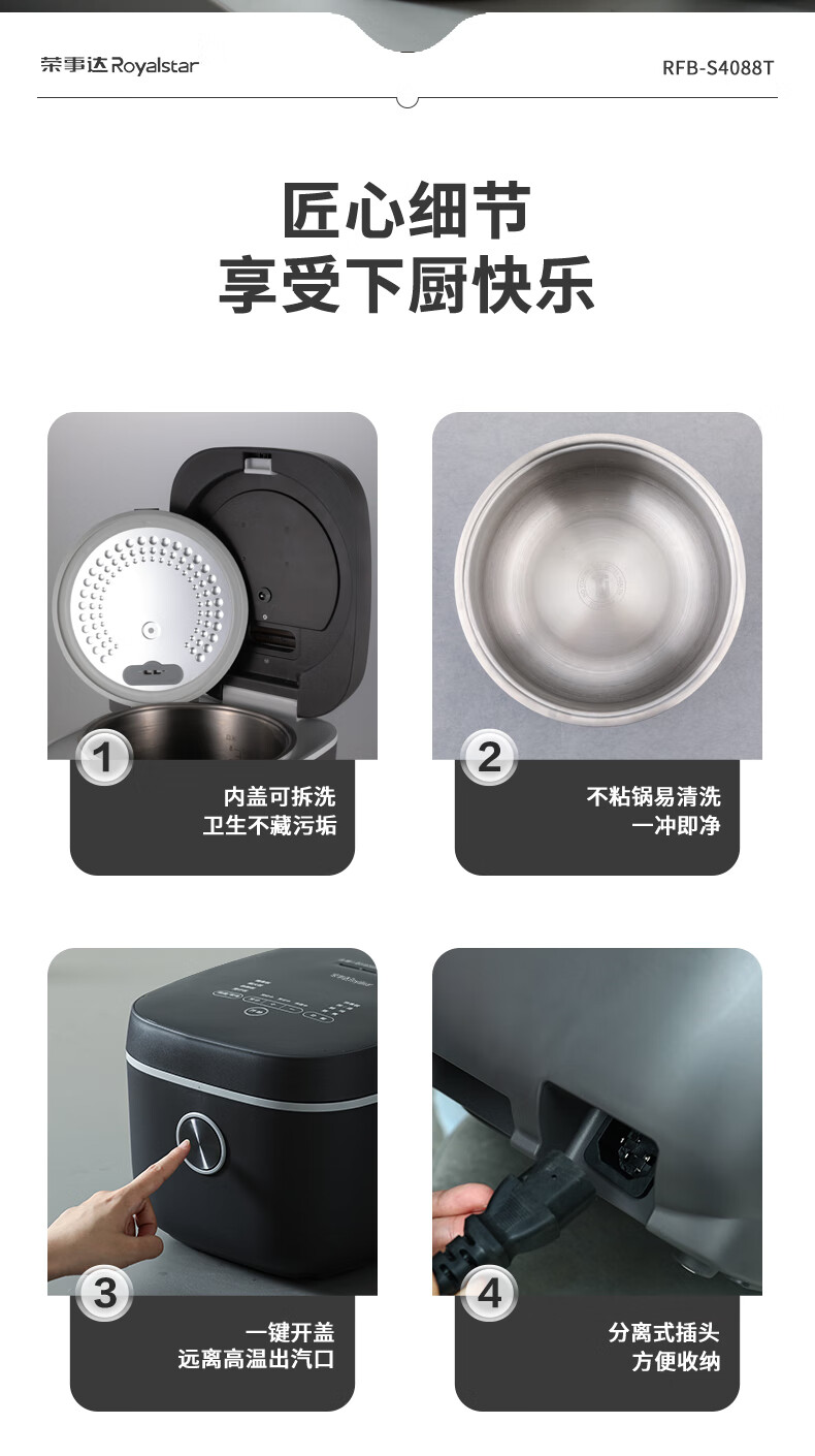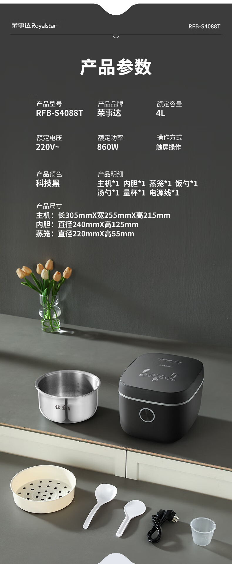 商品属性 [供应商] 得力集团有限公司 [品牌] 荣事达(Royalstar) [型号] RFB-S4088T [商品标题] 荣事达(Royalstar)RFB-S4088T 0涂层电饭煲4升(单位:台) [销售单位] 台