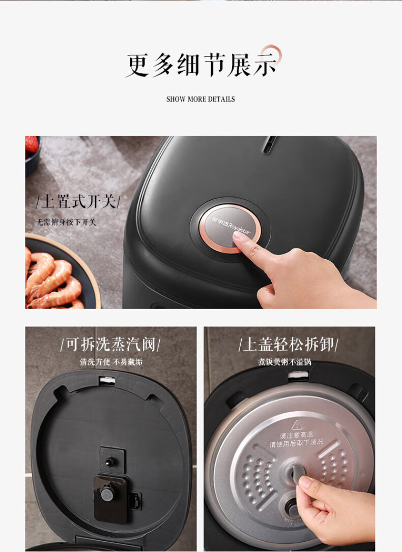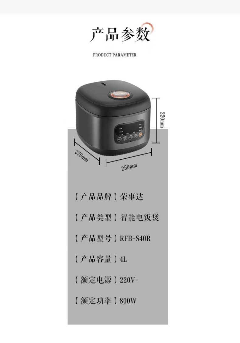 商品属性 [供应商] 得力集团有限公司 [品牌] 荣事达(Royalstar) [型号] RFB-S40R [商品标题] 荣事达(Royalstar)RFB-S40R电饭煲 4升(单位:台)灰色 [销售单位] 台