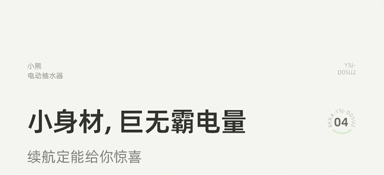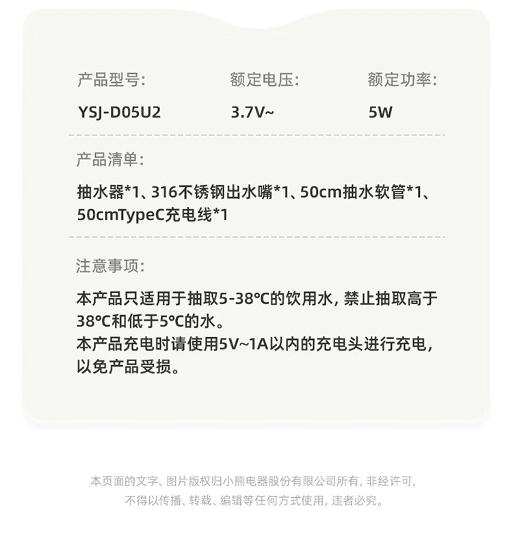 商品属性 [供应商] 深圳市云中鹤科技股份有限公司 [品牌名称:] 小熊(Bear) [商品型号:] YSJ-D05U2 [商品sku编码:] 1125899909101529 [重量:] 2.50kg [产地:] 中国 [单位:] 个