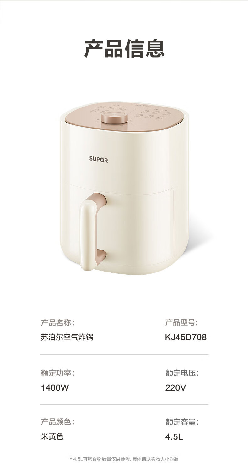 商品属性 [供应商] 深圳市云中鹤科技股份有限公司 [品牌名称:] 苏泊尔(SUPOR) [商品型号:] KJ45D708 [商品sku编码:] 1125899909118111 [重量:] 3.81kg [产地:] 浙江 [单位:] 个
