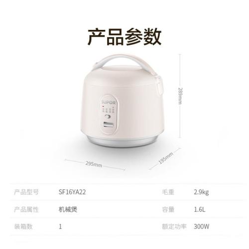 商品属性 [供应商] 北京京东世纪信息技术有限公司 [内胆材质] 铝合金 [能效等级] 四级能效 [额定功率] 300W [电源线长] 0.8m [产品净重] 1kg [压力值] 1kPa [主色系] 米色系 [上市时间] 2021-01 [蒸屉材质] PP(聚丙烯) [额定电压] 220V [涂层材质] 特氟龙涂层 [认证型号] SF16YA22 [容量] 1.6L