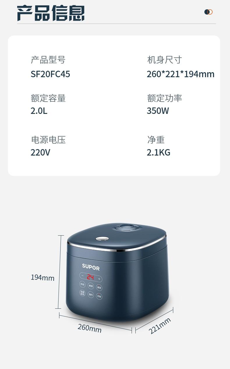 商品属性 [供应商] 深圳市怡亚通供应链股份有限公司 [品牌:] 苏泊尔(SUPOR) [型号:] SF20FC45 [规格:] 2L