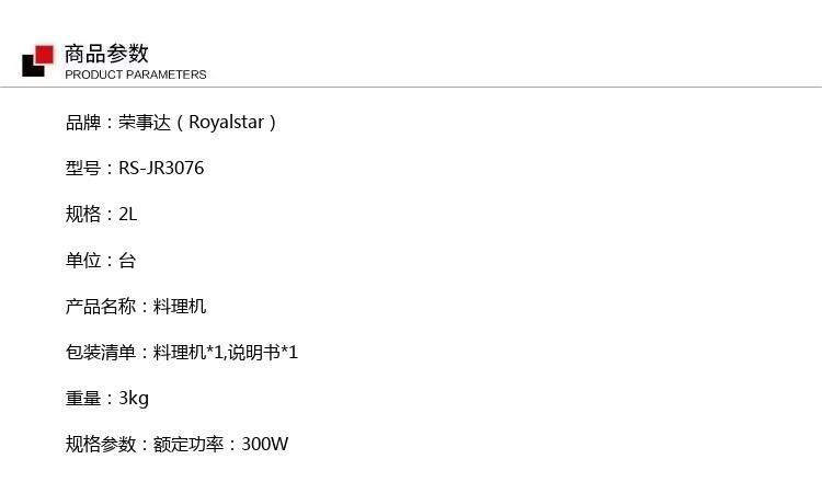 商品属性 [供应商] 深圳齐心集团股份有限公司 [品牌] 荣事达(Royalstar) [型号] RS-JR3076 [额定功率] 300W