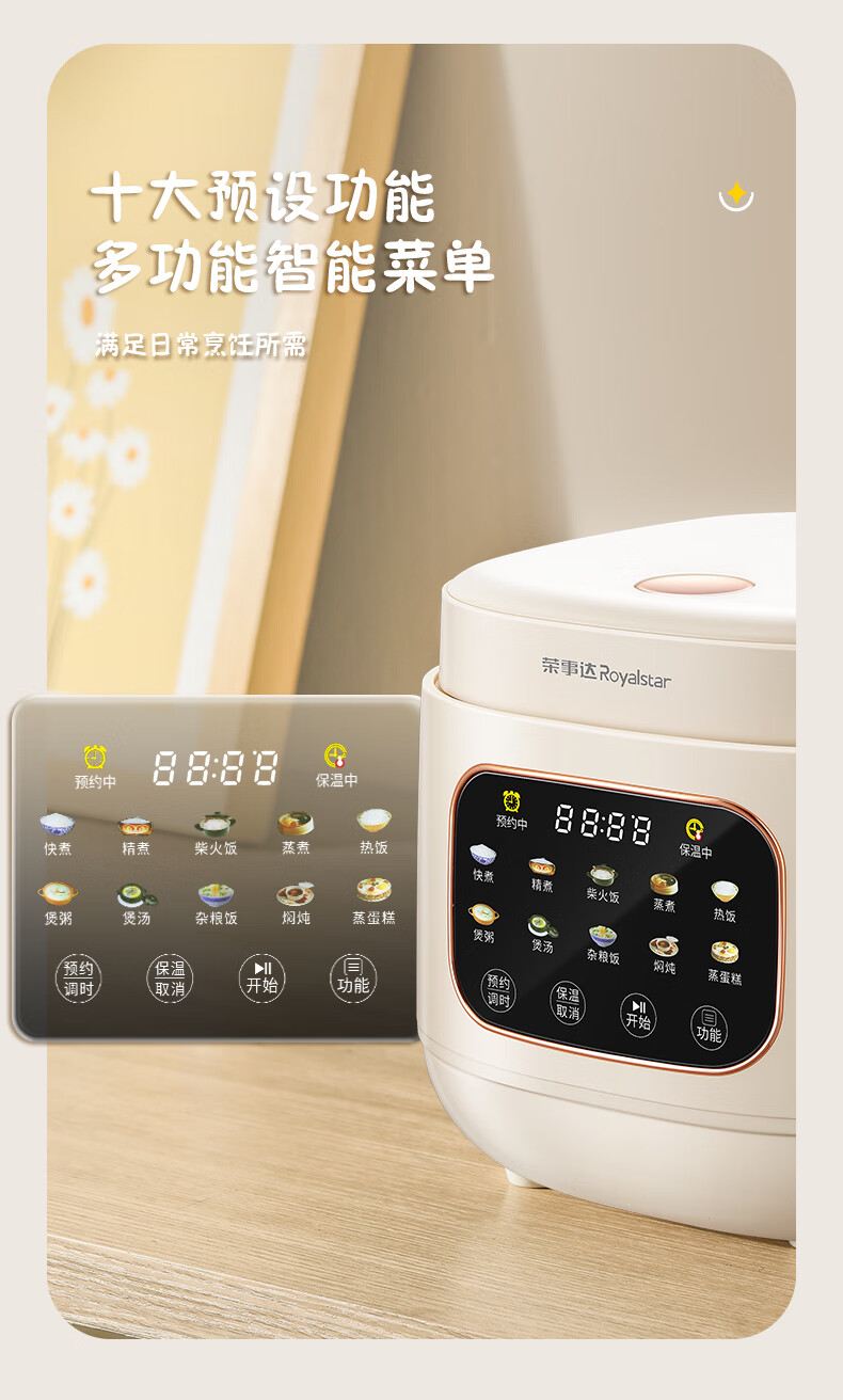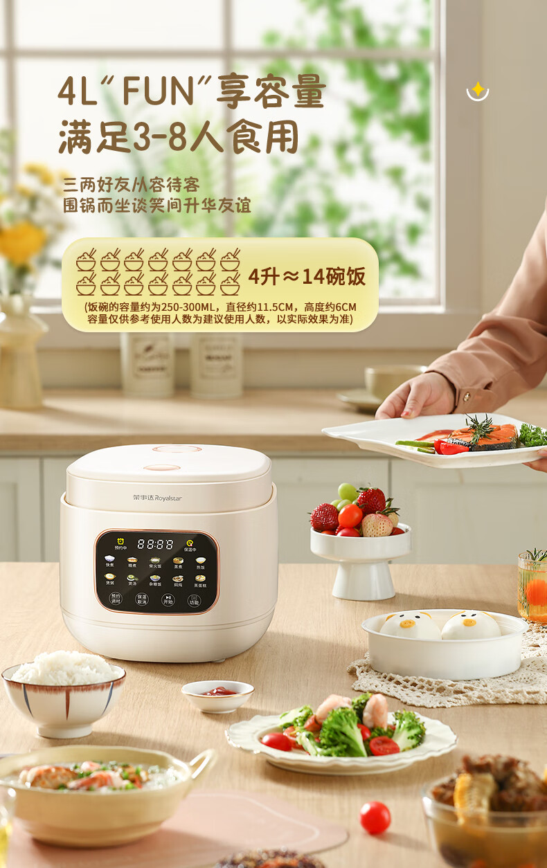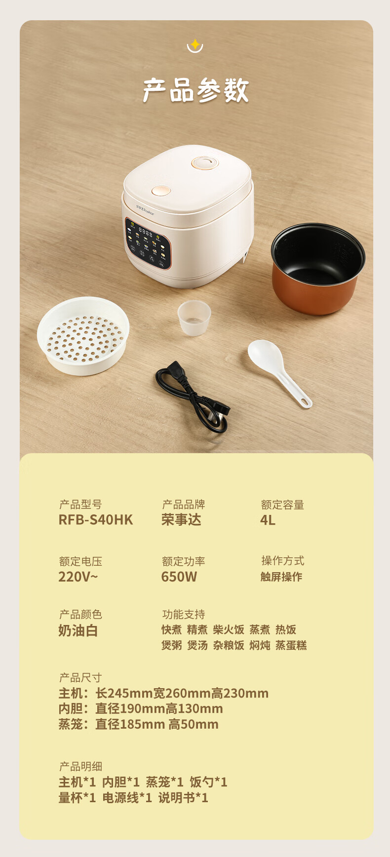 商品属性 [供应商] 得力集团有限公司 [品牌] 荣事达(Royalstar) [型号] RFB-S40HK [商品标题] 荣事达(Royalstar)RFB-S40HK电饭煲(单位:台) [销售单位] 台