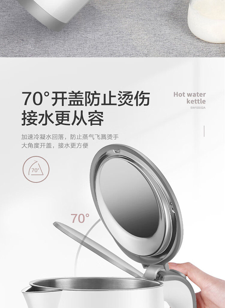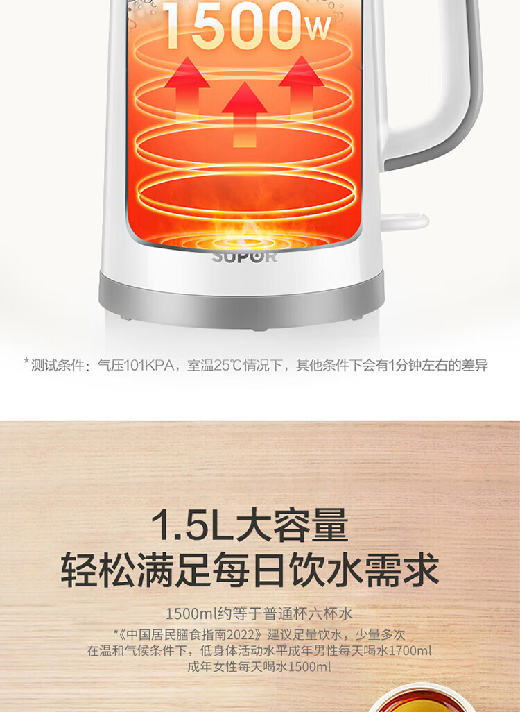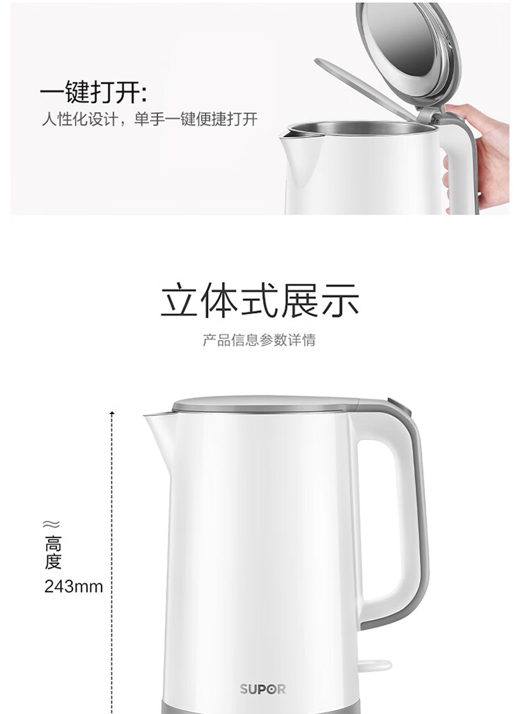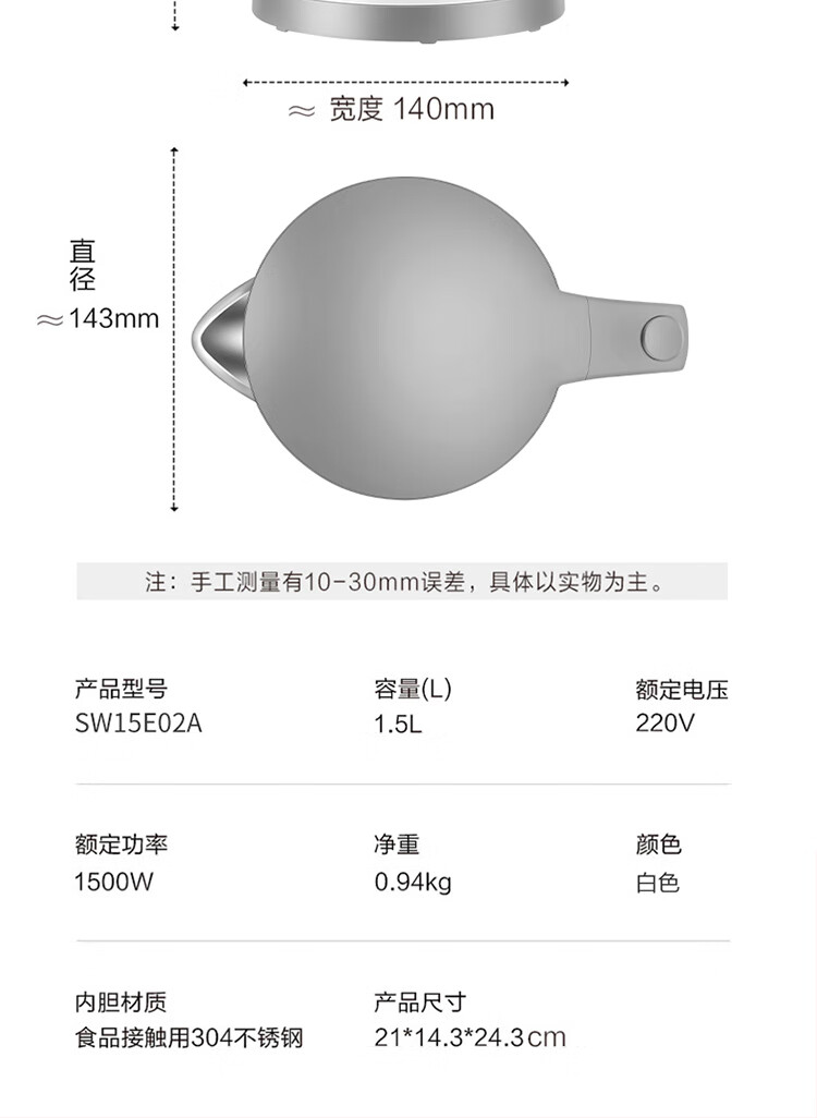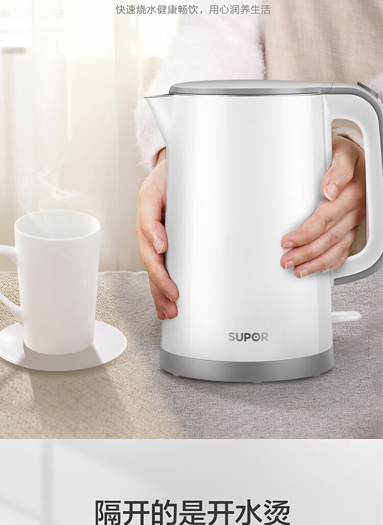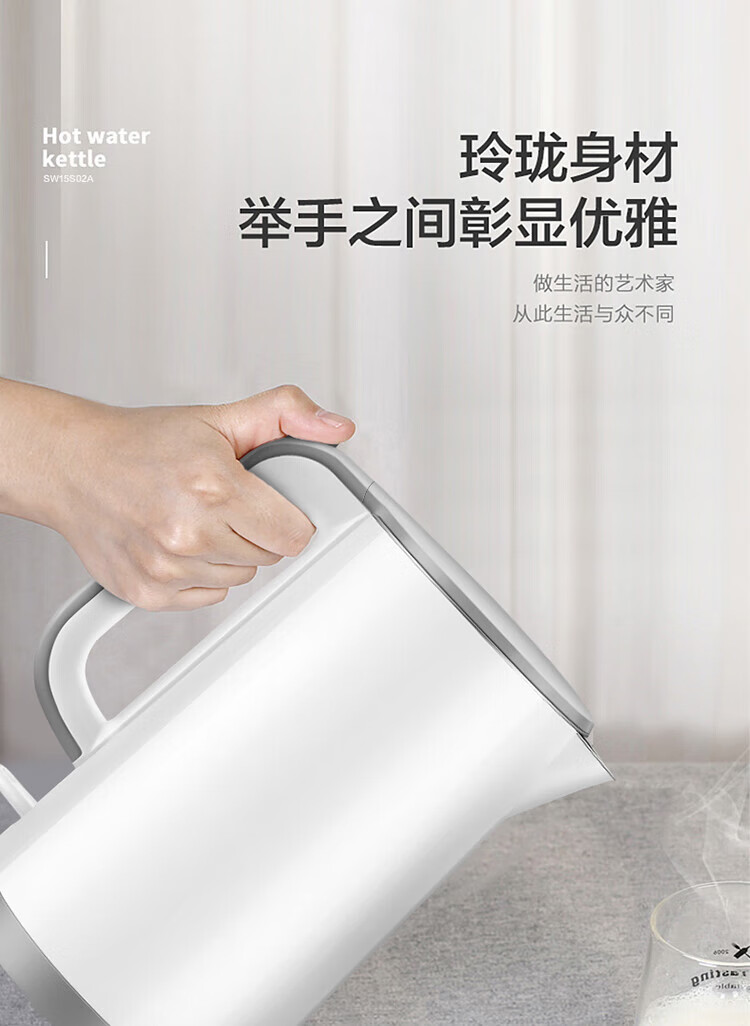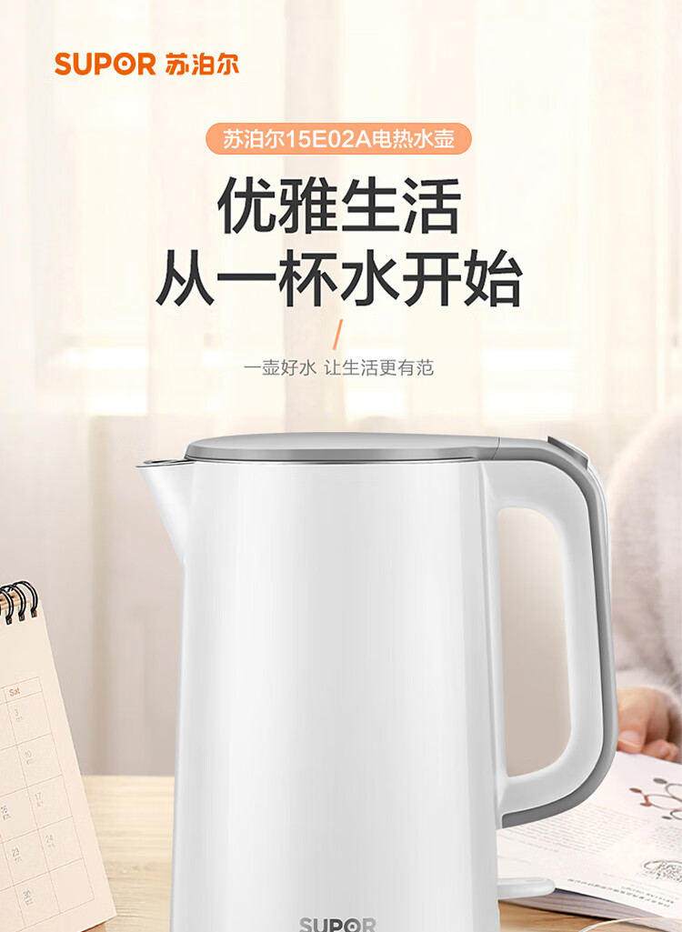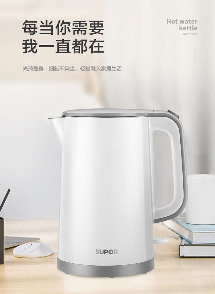 商品属性 [供应商] 得力集团有限公司 [品牌] 苏泊尔(SUPOR) [型号] SW15E02A [商品标题] 苏泊尔(SUPOR) 电水壶 SW15E02A 1.5L (单位:台) 白色 [销售单位] 台