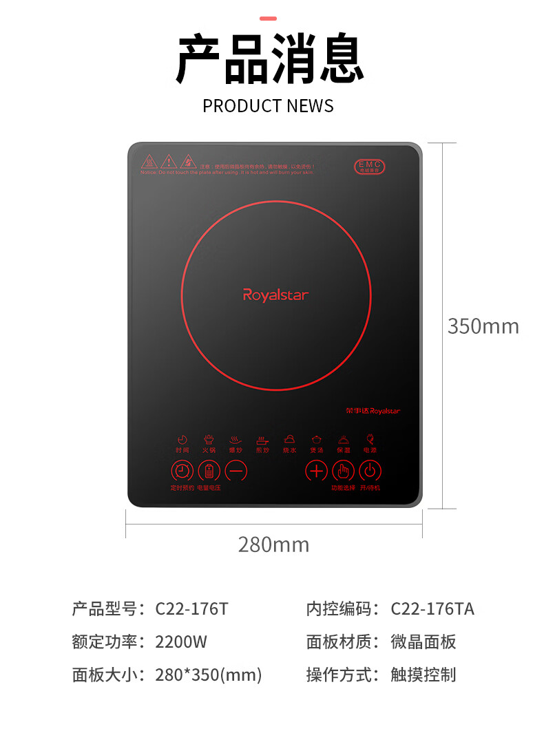 商品属性 [供应商] 德致商成集团有限公司 [商品毛重] 2.2kg [额定功率(W)] 2200W [产品类别] 电磁炉 [操控方式] 触摸控制 [火力档位] 8 [面板样式] 微晶面板 [额定功率] 2200W