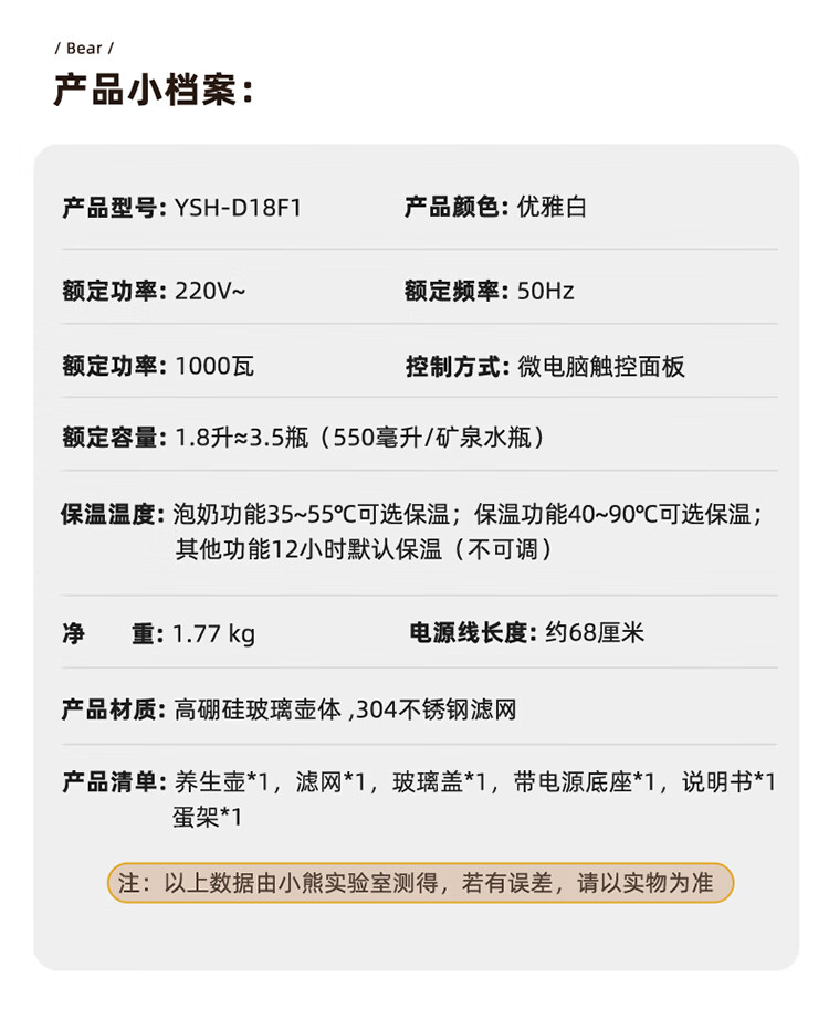 商品属性 [供应商] 深圳市怡亚通供应链股份有限公司 [品牌:] 小熊(Bear) [型号:] YSH-D18F1 [规格:] 1.8L