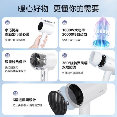 商品属性 [供应商] 德致商成集团有限公司 [负离子量] 5千万ions/㎝³ [商品毛重] 0.56kg [最大功率] 1500W-1799W [风温档位] 2档 [最大噪声] 76-80dB(A) [包装形式] 普通装 [最大风速] 16-20m/s [产品净重] 0.43kg [上市时间] 2021-06 [热风档位] 二档 [外观设计] 直筒型 [风嘴类型] 造型风嘴 [适用场景] 校园,家用 [适用发质] 正常发质 [额定功率] 1600W [风嘴安装方式] 卡扣式 [特色功能] 档位记忆 [控温类型] 一键冷风 [电源线长] 1.65m [操作方式] 机械式 [冷风档位] 二档 [商品产地] 中国大陆 [主色系] 白色 [产品尺寸] 长258mm;宽105mm;高75mm [认证型号] MB-AJ0501 [风速档位] 2档 [手柄是否可折叠] 不可折叠 [护发类型] 负离子