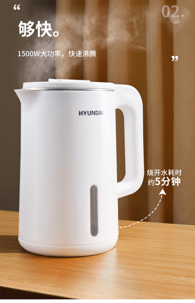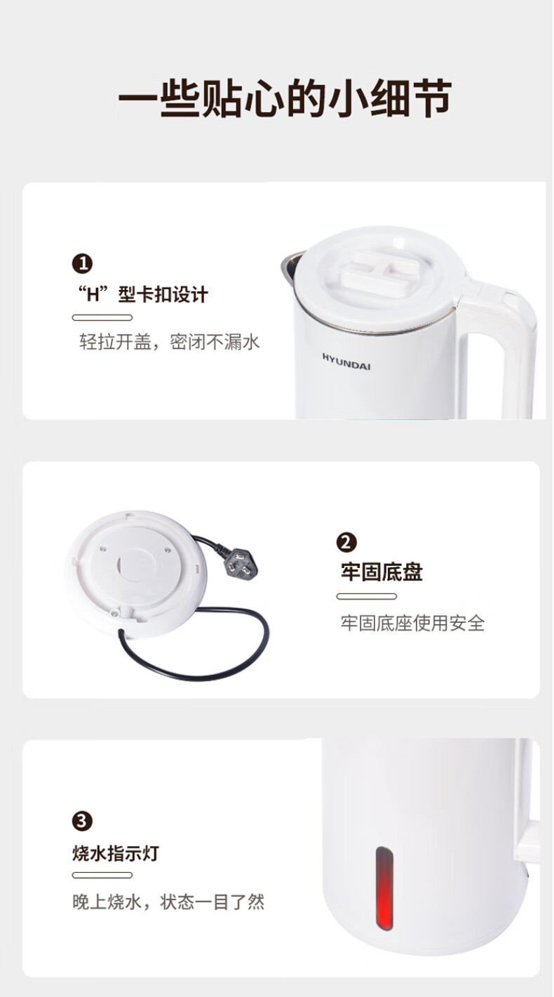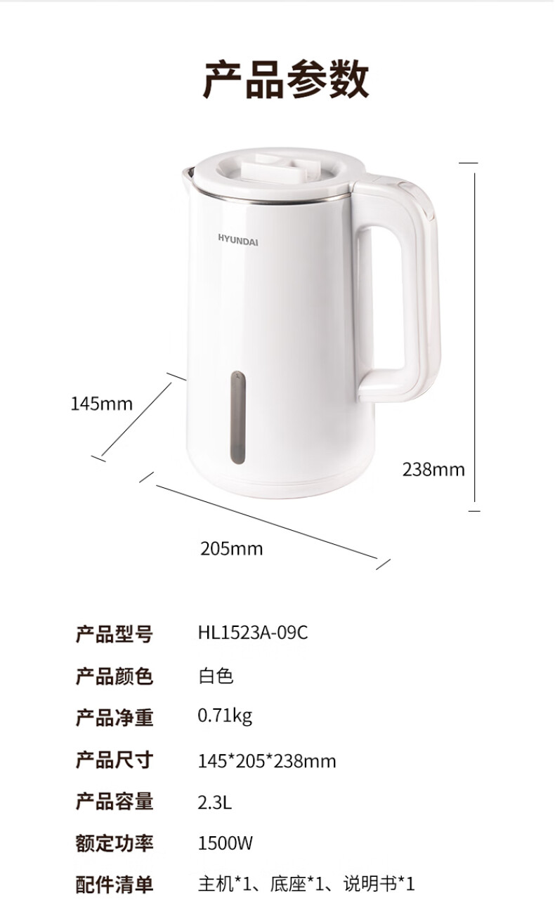 商品属性 [供应商] 得力集团有限公司 [品牌] 现代(HYUNDAI) [型号] HL1523A-09C [商品标题] 现代(HYUNDAI) HL1523A-09C 双层不锈钢电热水壶 2.3L(单位:台) [销售单位] 台