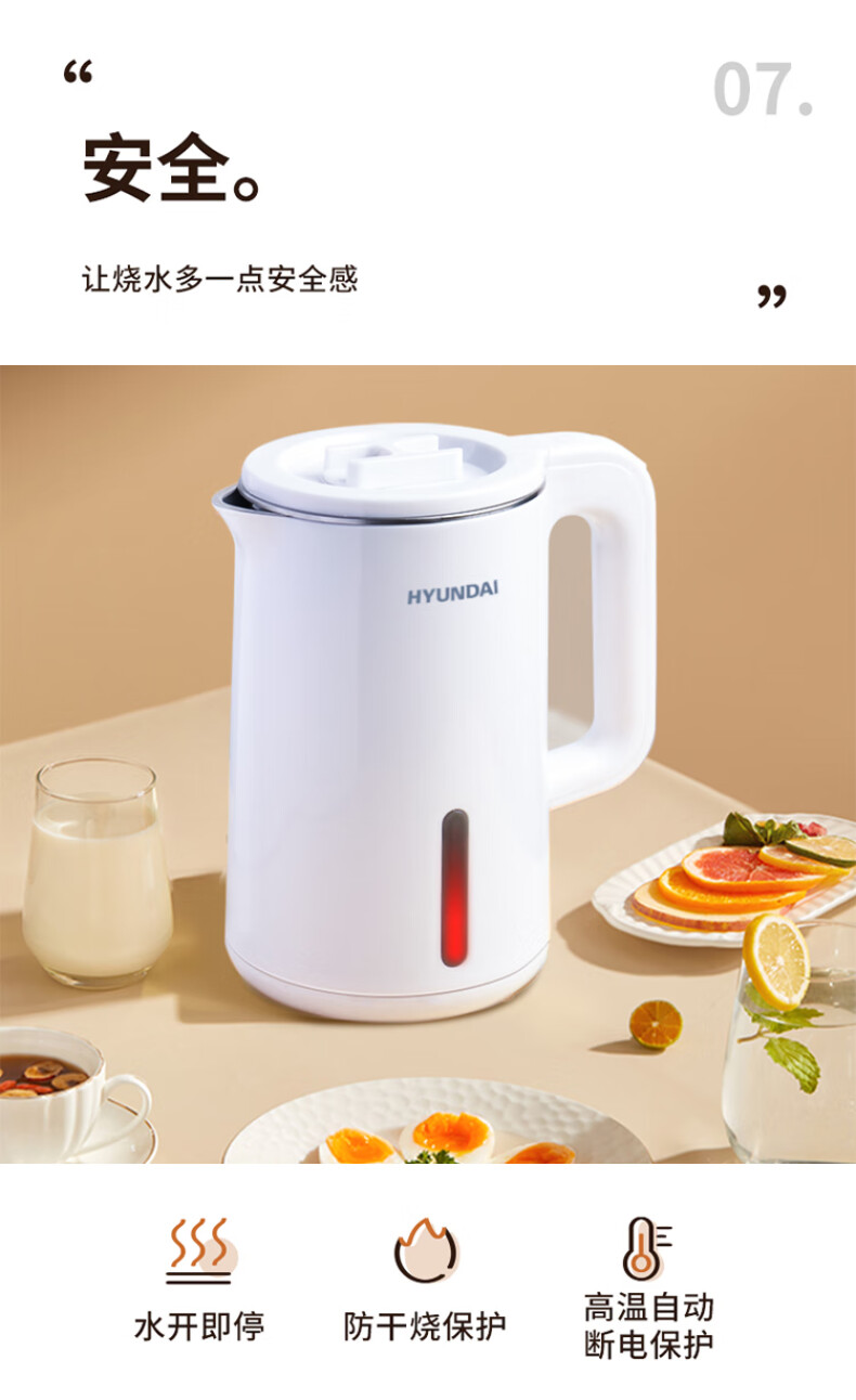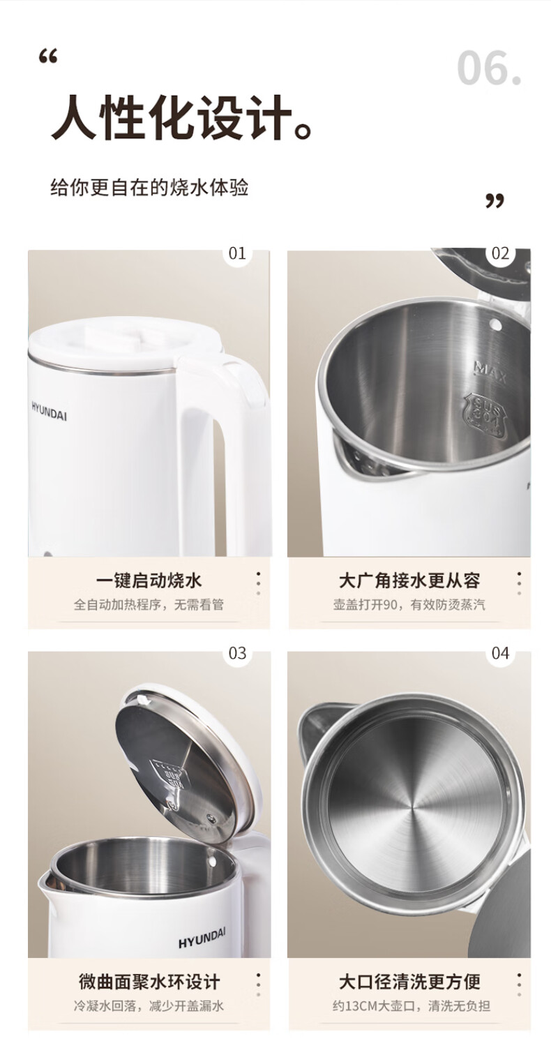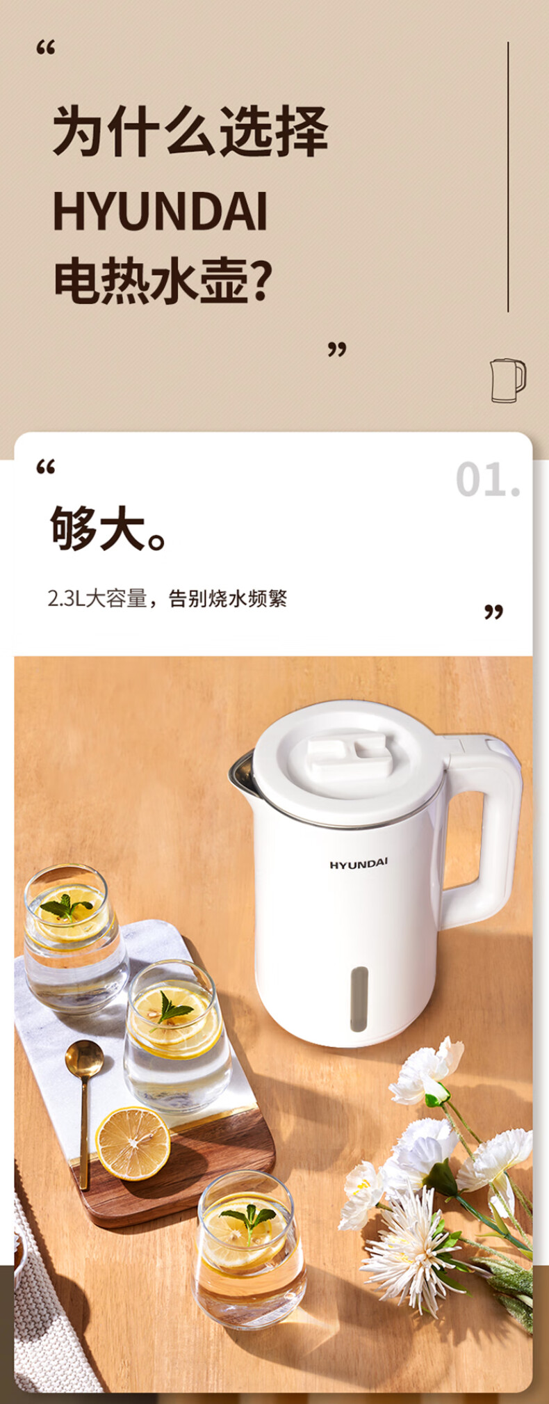 商品属性 [供应商] 得力集团有限公司 [品牌] 现代(HYUNDAI) [型号] HL1523A-09C [商品标题] 现代(HYUNDAI) HL1523A-09C 双层不锈钢电热水壶 2.3L(单位:台) [销售单位] 台