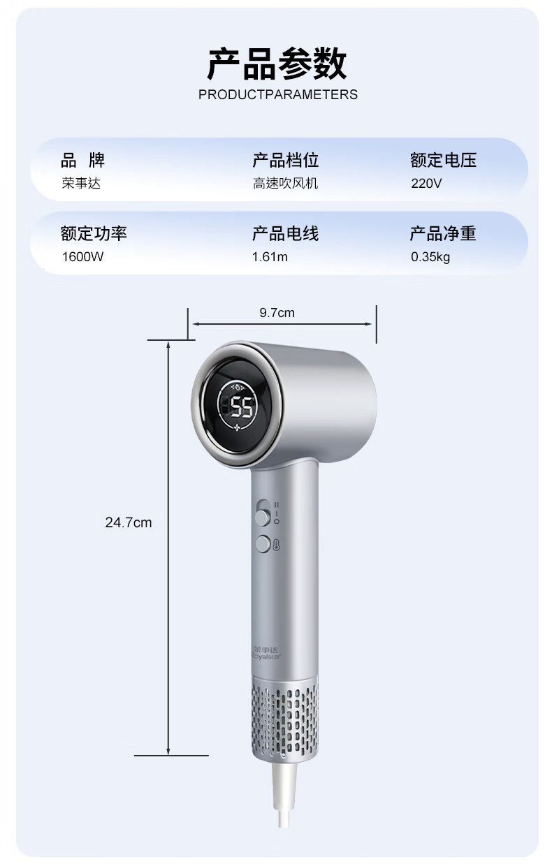 商品属性 [供应商] 德致商成集团有限公司 [产品尺寸(mm)] 24.7*9.7cm [额定电压] 220V [额定功率] 1600W [电源线长] 1.61m [产品净重] 0.35kg [商品产地] 中国大陆