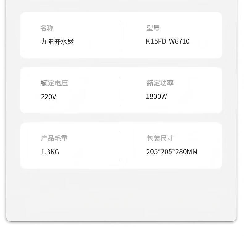 商品属性 [供应商] 得力集团有限公司 [货号] K15FD-W6710 [功率] 1800W [额定电压] 220V [型号] K15FD-W6710 [容量] 1.5L [包装尺寸] 205*205*280MM