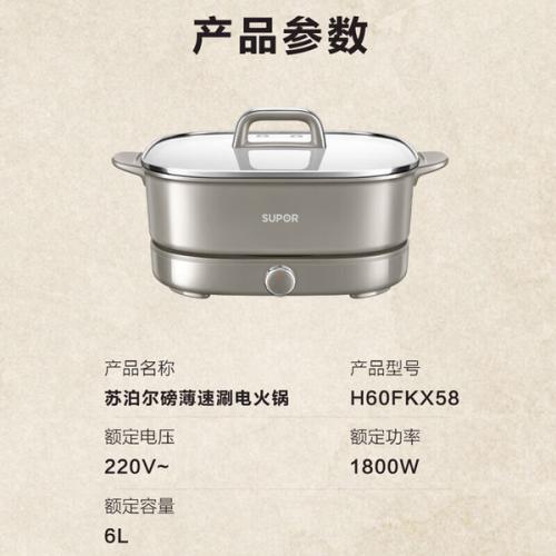 商品属性 [供应商] 上海邮乐网络技术有限公司 [属性名称] 属性值 [产品名称] 苏泊尔磅薄速涮电火锅 [产品型号] H60FKX58 [额定电压] 220V [额定功率] 1800W [额定容量] 6L