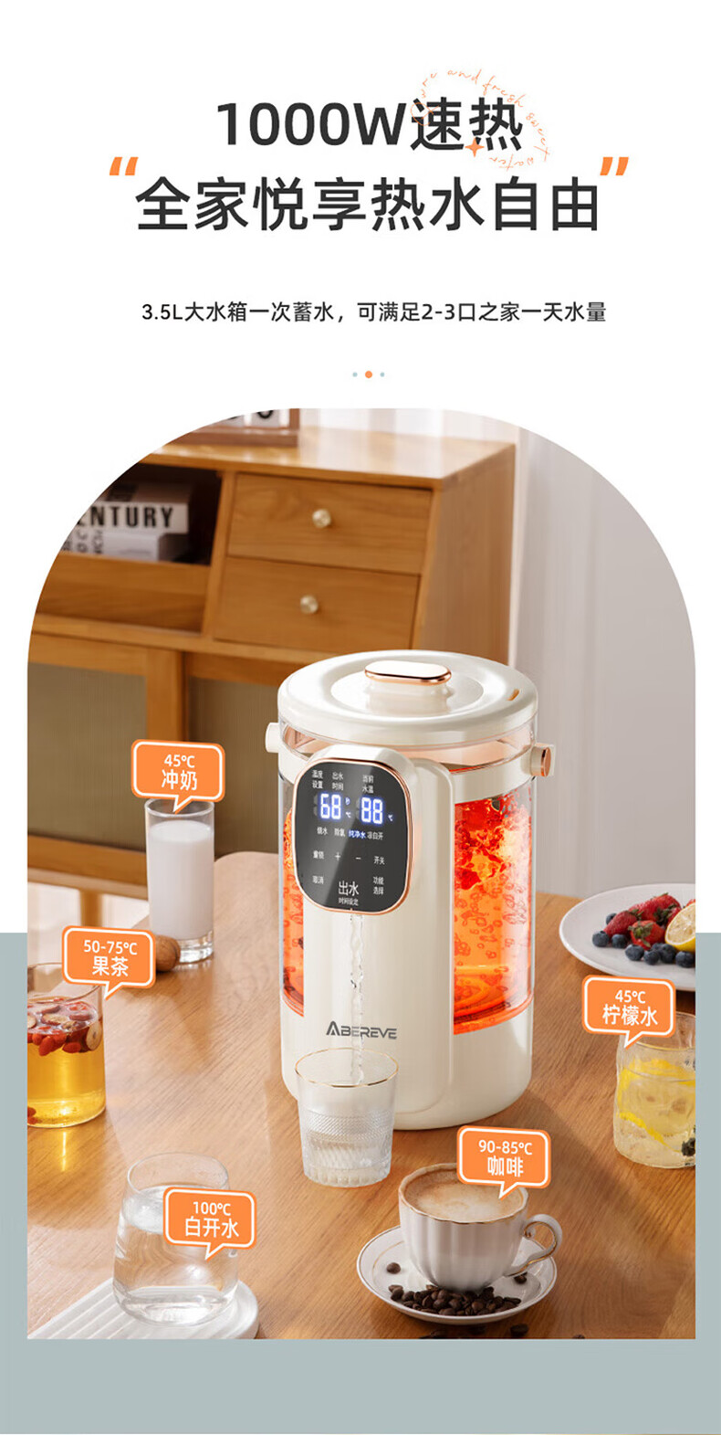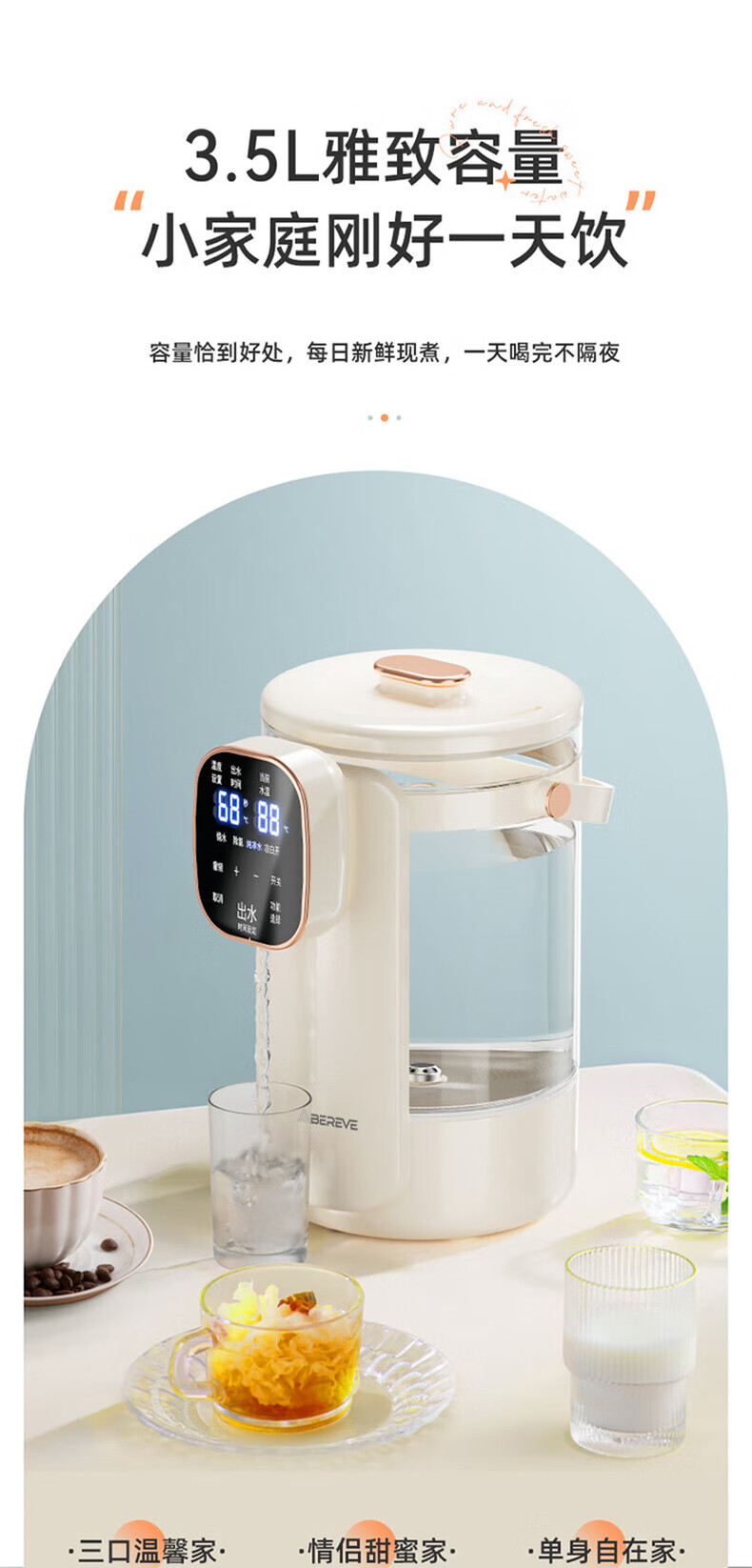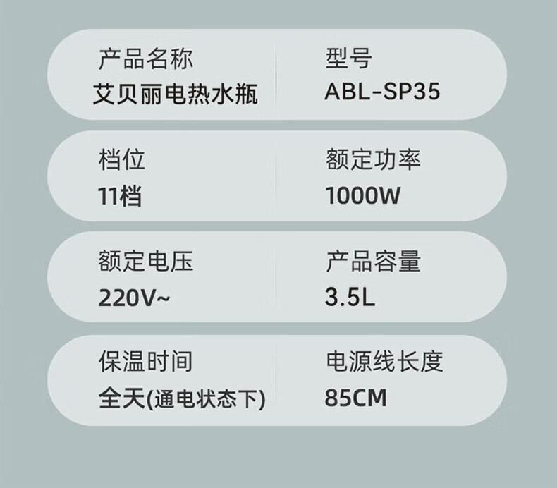 商品属性 [供应商] 得力集团有限公司 [货号] ABL-SP35 [壶体密封方式] 有缝焊接 [适用场景] 家用 [额定功率] 1000W [特征特质] 无附加功能 [内置配件] 无配件 [电源线长] 0.85m [CCC强制性认证] 否 [产品净重] 1.7kg [上市时间] 2024-11 [组合样式] 单壶 [功能] 单段控温 [材质] 外塑内钢 [额定电压] 220V [开盖方式] 弹盖 [认证型号] ABL-SP35 [上水方式] 无自动上水功能 [容量] 3.5L [类型] 电热水壶