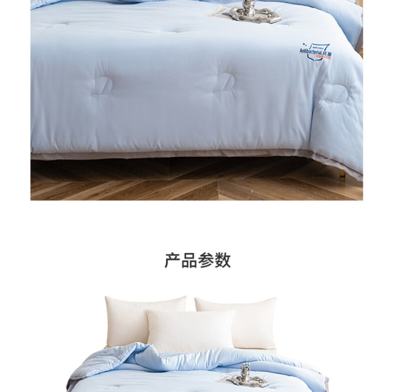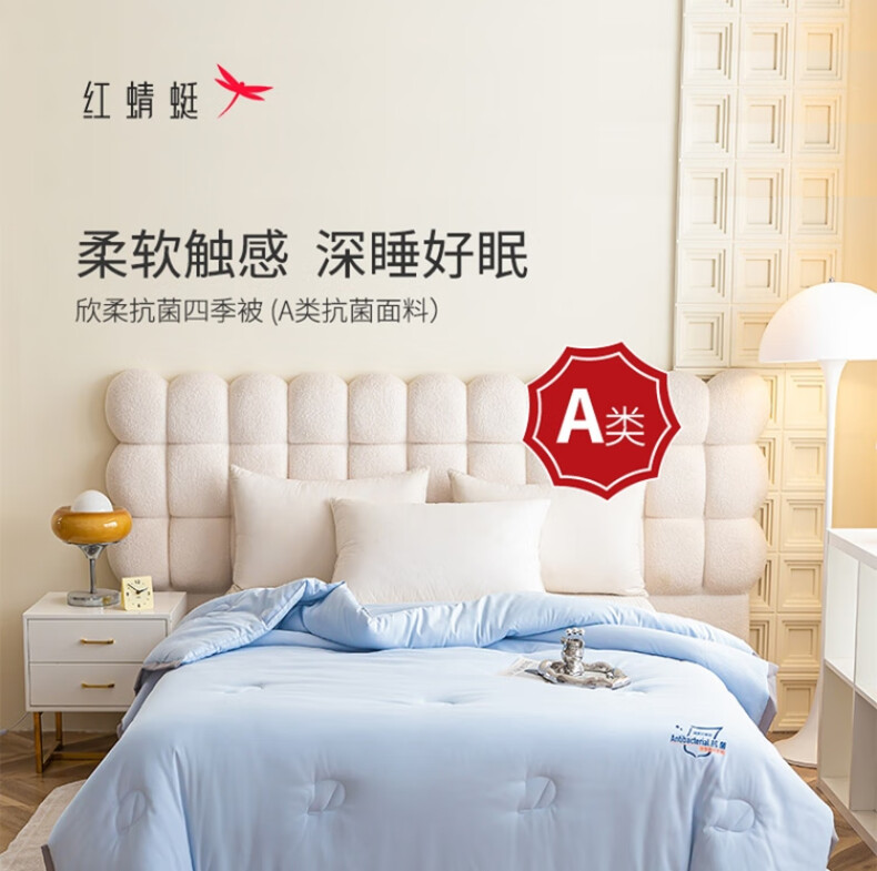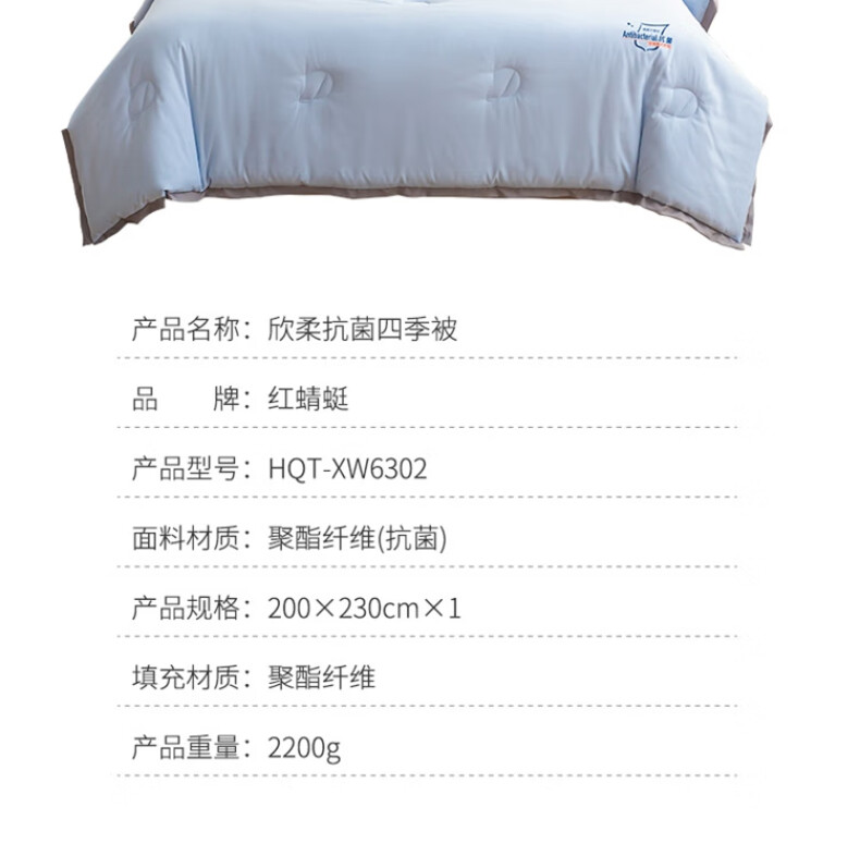 商品属性 [供应商] 得力集团有限公司 [品牌] 红蜻蜓 [型号] HQT-XW6302 [商品标题] 红蜻蜓欣柔抗菌四季被HQT-XW6302 200*230CM 2200g (单位:床) [销售单位] 床