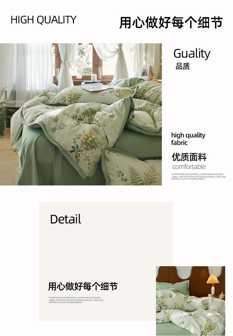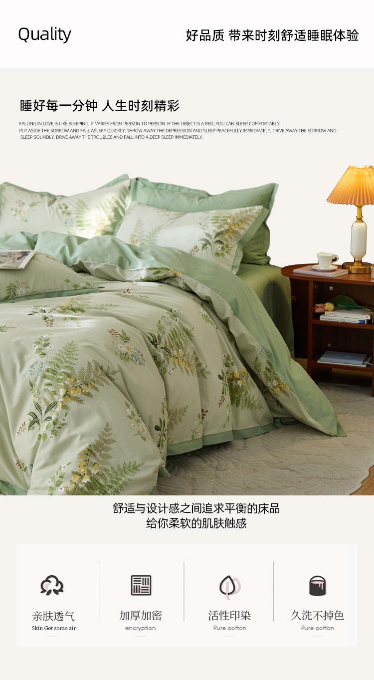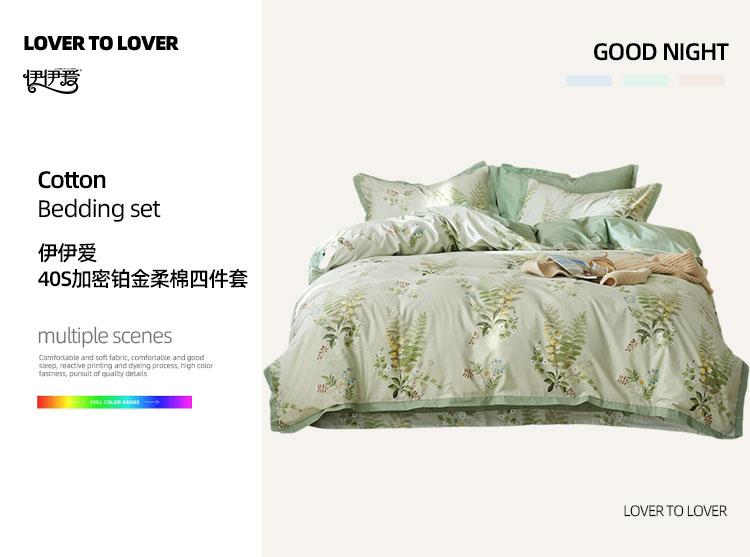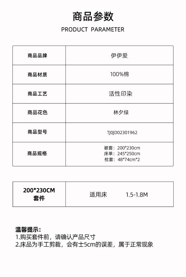 商品属性 [供应商] 得力集团有限公司 [品牌] 伊伊爱 [型号] TJ0JD02301962 [被套] 200*230cm [床单] 245*250cm [枕套] 48*74cm*2 [适用床] 1.5-1.8M [面料] 100%棉 [工艺] 活性印染