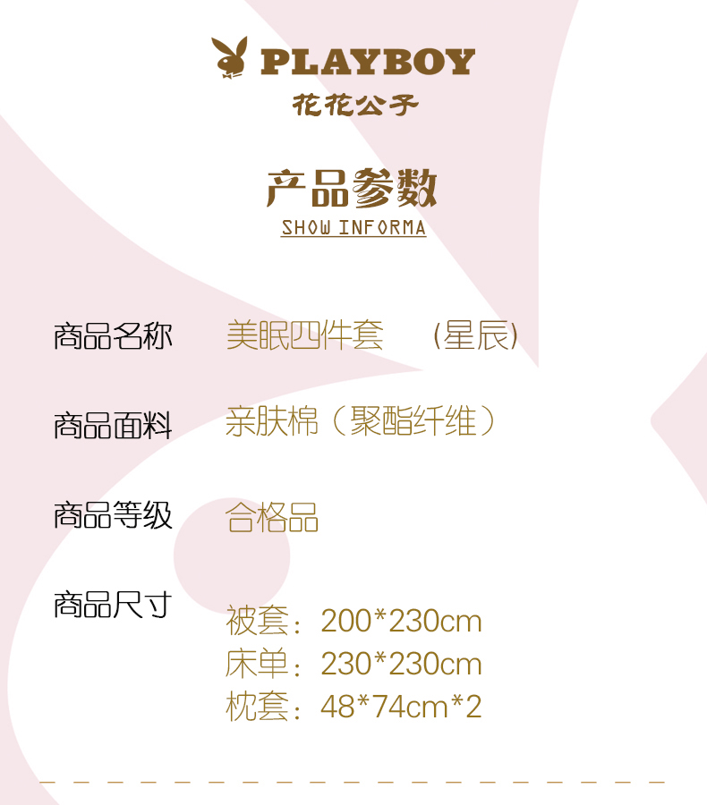 商品属性 [供应商] 得力集团有限公司 [品牌] 花花公子(PLAYBOY) [型号] PB-25YZ112 [商品标题] 花花公子 PB-25YZ112 美眠四件套 被套:200*230cm 床单:230*230cm 枕套:48*74cm*2(单位:套)颜色:星辰 [销售单位] 套