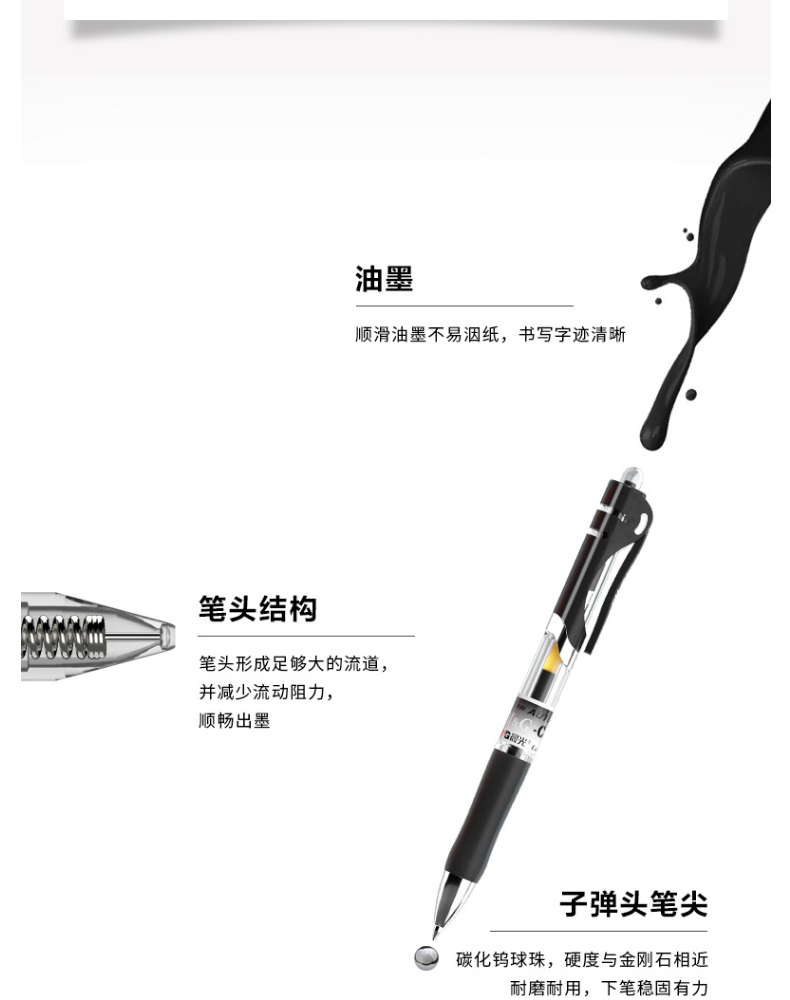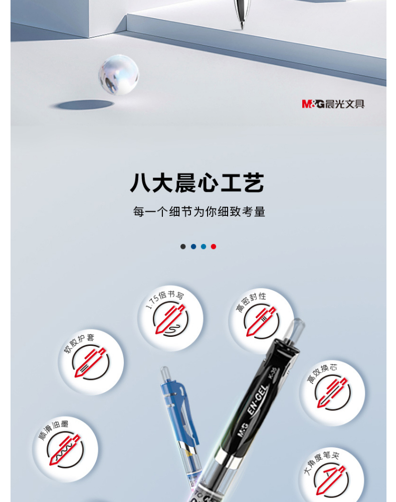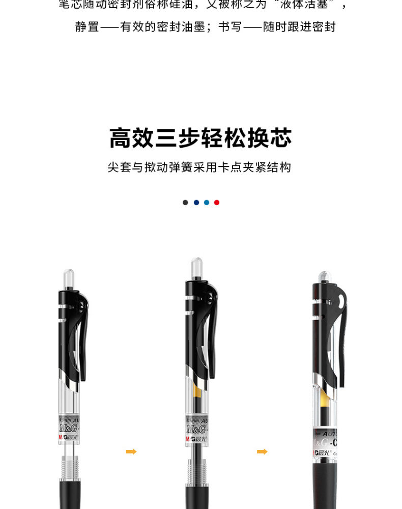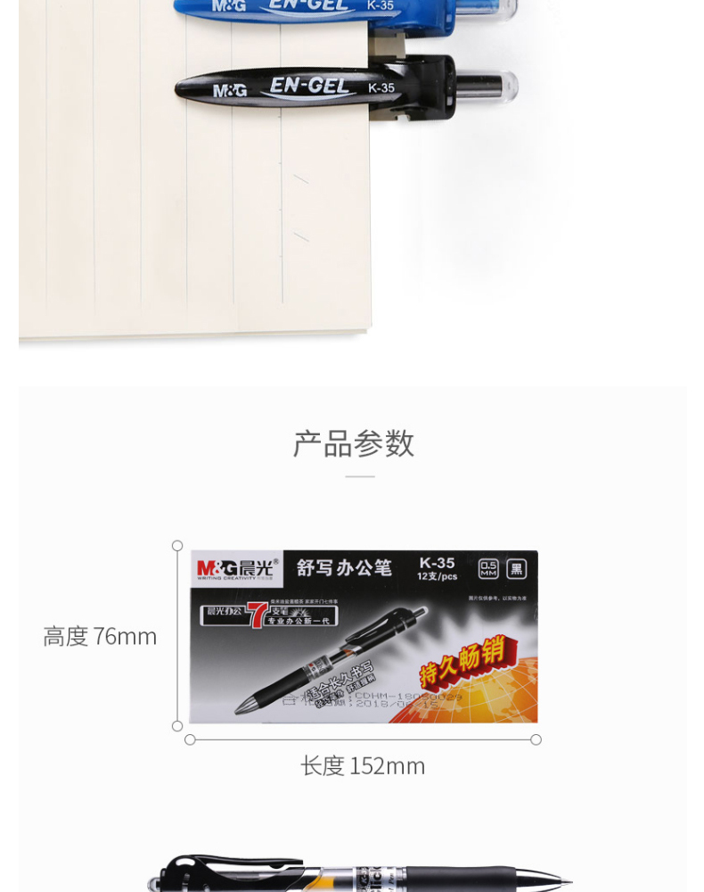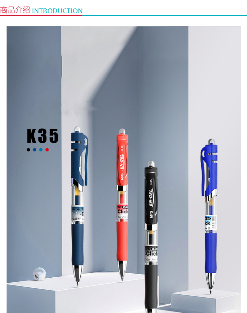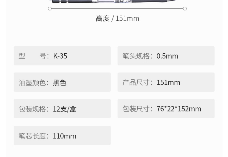商品属性 [供应商] 科力普科技集团股份有限公司 [打开方式] 按压式 [入数] 1支 [笔尖粗细] 0.5mm [适用替芯] 笔芯型号:G-5 [笔芯颜色] 黑色 [品牌] 晨光 [型号] K-35 [内包装] 12支/盒