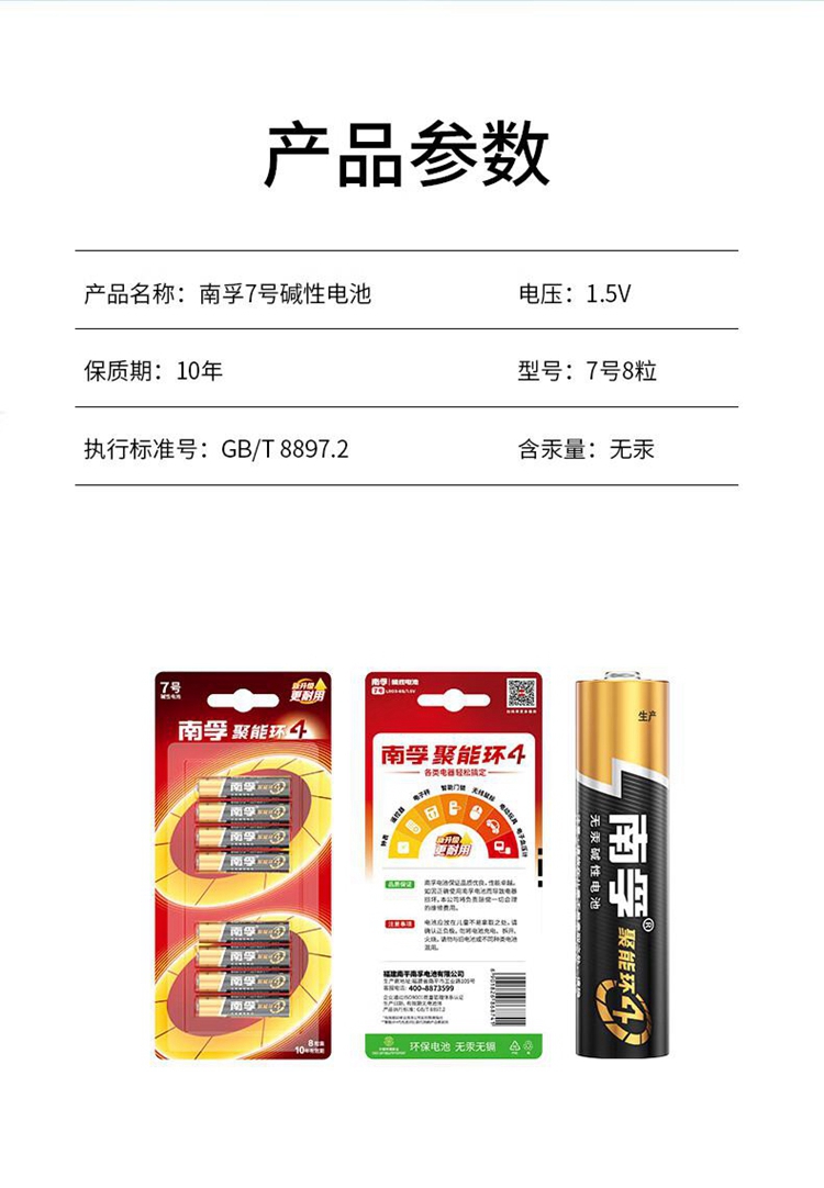 商品属性 [供应商] 得力集团有限公司 [品牌] 南孚(NANFU) [型号] LR03-8B/7号 [商品标题] 南孚LR03-8B/7号碱性电池8节/卡 聚能环4代(单位:卡) [销售单位] 卡