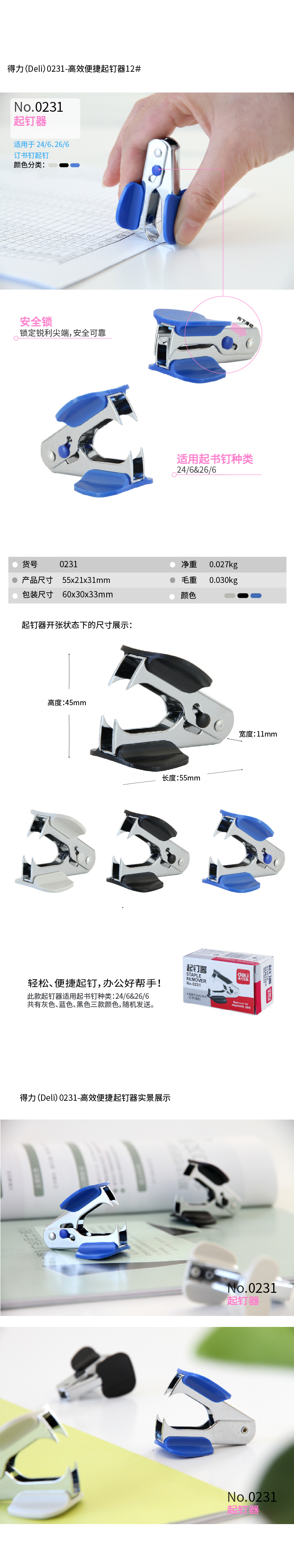 商品属性 [供应商] 得力集团有限公司 [品牌] 得力 [型号] 0231 [商品标题] 得力0231起钉器55*21*31mm(蓝)(单位:只) [销售单位] 台 [名称] 起钉器