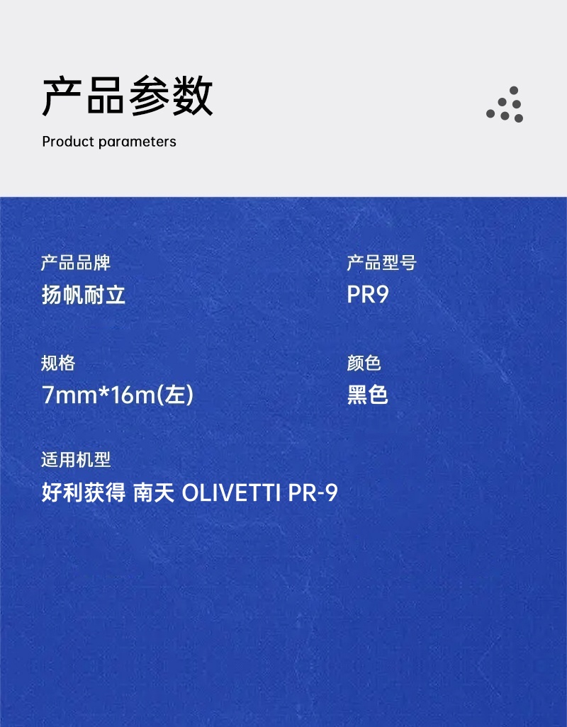 商品属性 [供应商] 得力集团有限公司 [品牌] 扬帆耐立(YFHC) [型号] PR9-J [商品标题] 扬帆耐立PR9-J色带黑色370*95*28mm(支) [销售单位] 支