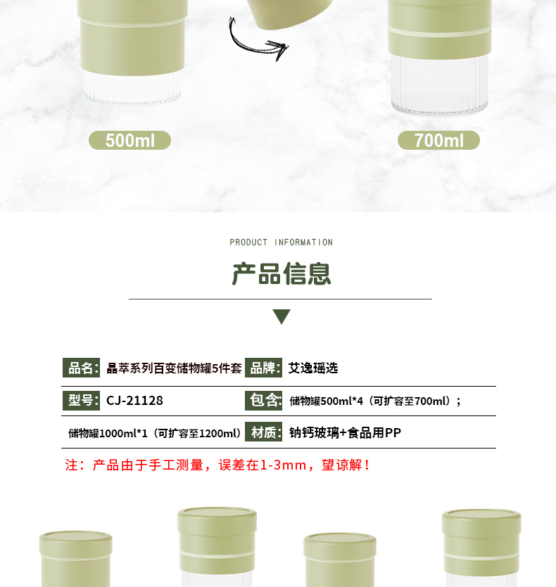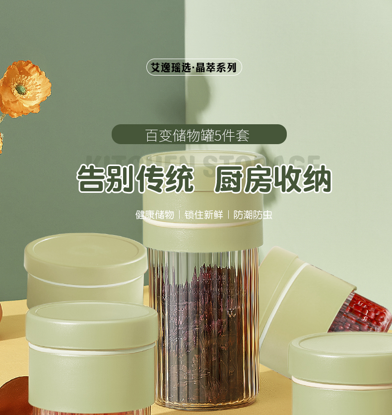 商品属性 [供应商] 得力集团有限公司 [品牌] 艾逸瑶选 [型号] CJ-21128 [商品标题] 艾逸瑶选晶萃系列百变储物罐5件套CJ-21128保鲜盒/食物盒(单位:套) [销售单位] 套