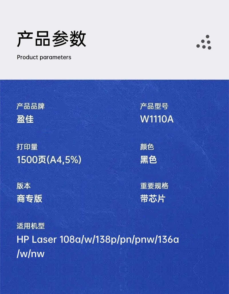 商品属性 [供应商] 史泰博(上海)有限公司 [品牌] 盈佳(Ink Cartridge) [型号] W1110A