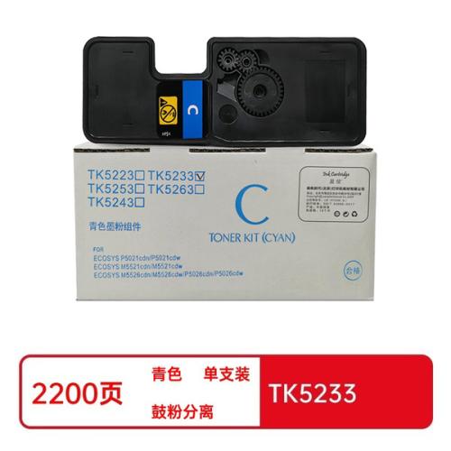 商品属性 [供应商] 得力集团有限公司 [品牌] 盈佳 [型号] TK5233 [商品标题] 盈佳兼容TK5233粉盒(鼓粉分离)商专版带芯片青色单支装(适用于京瓷Kyocera ECOSYS P5021cdn/P5021cdW)打印页数:2200页(A4,5%)(单位:支) [销售单位] 支