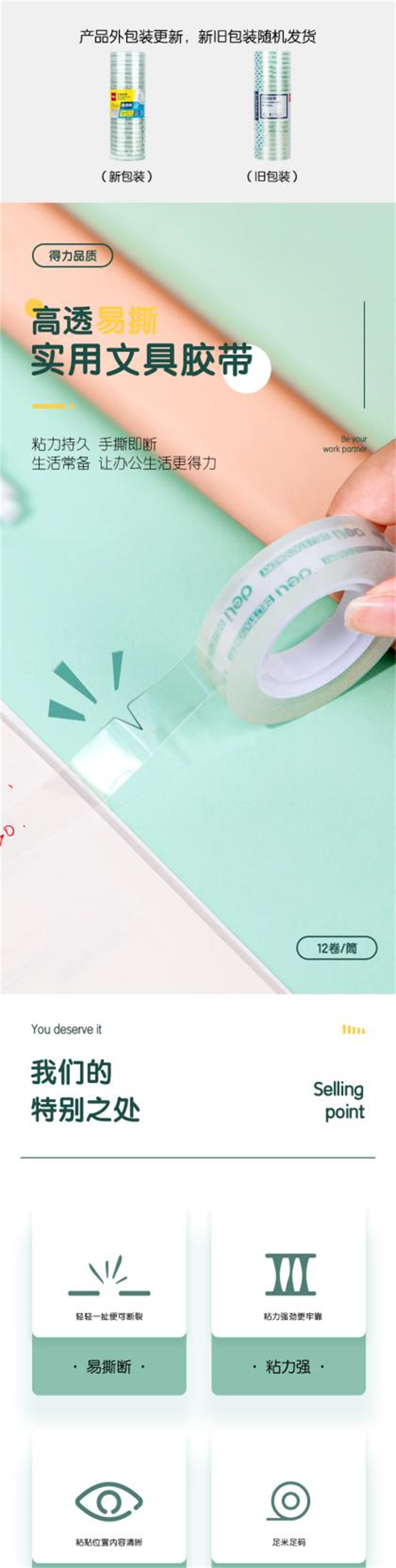商品属性 [供应商] 得力集团有限公司 [品牌] 得力 [型号] 30015 [商品标题] 得力 30015 文具胶带 12mm*30y*38um 12卷/筒 (单位:筒) [销售单位] 筒