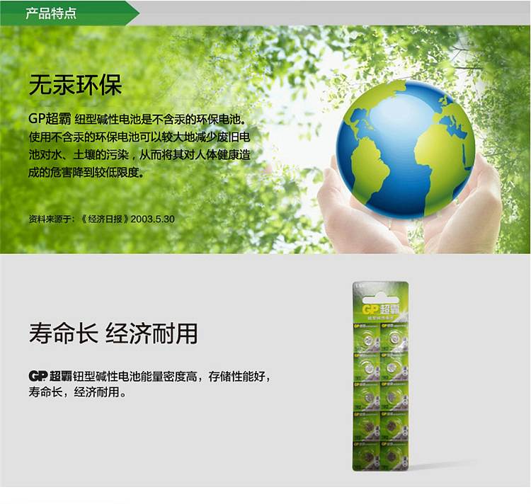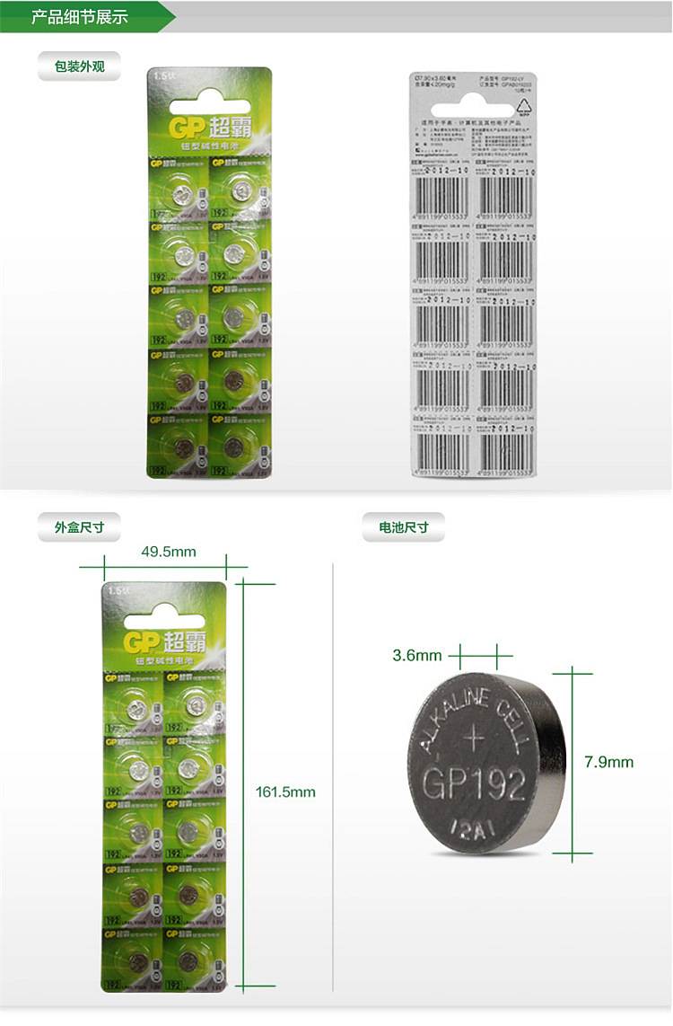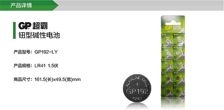 商品属性 [供应商] 得力集团有限公司 [品牌] 超霸(GP) [型号] GP192-LY [商品标题] 超霸GP192-LY碱性纽扣电池10粒/卡(卡) [销售单位] 卡