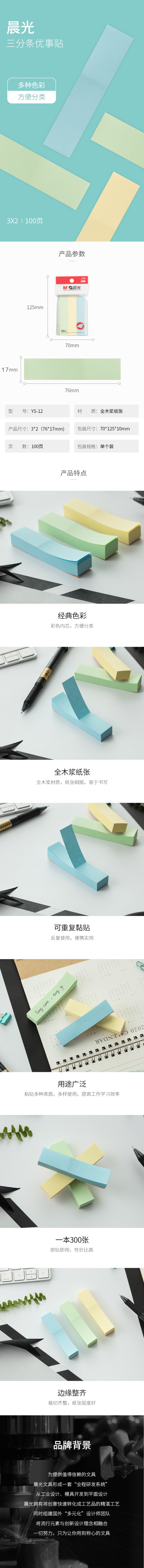 商品属性 [供应商] 全程速达科技有限公司 [名称] 内容 [品牌:] 晨光(M&G) [商品名称:] 3色便利贴 粘性标签贴三分条 [型号:] YS-12