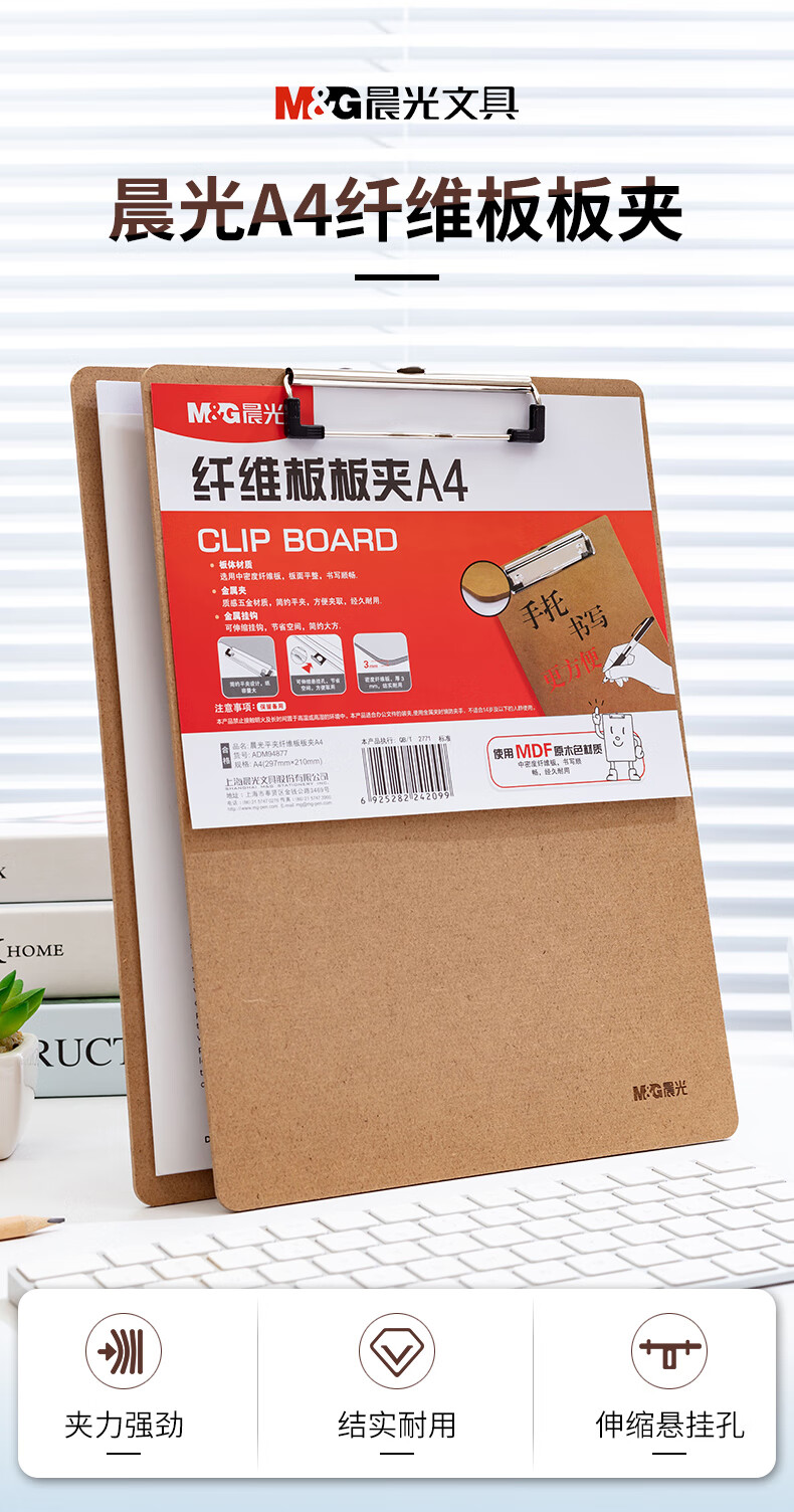 商品属性 [供应商] 德致商成集团有限公司 [适用场景] 办公,报告,会议,学习 [功能] 可防水,可防锈 [材质] 木质 [包装清单] 晨光(M&G)文具A4原木色纤维板书写板夹记事夹文件夹写字垫板单个装ADM94877 [款式] 竖版 [类型] 竖版