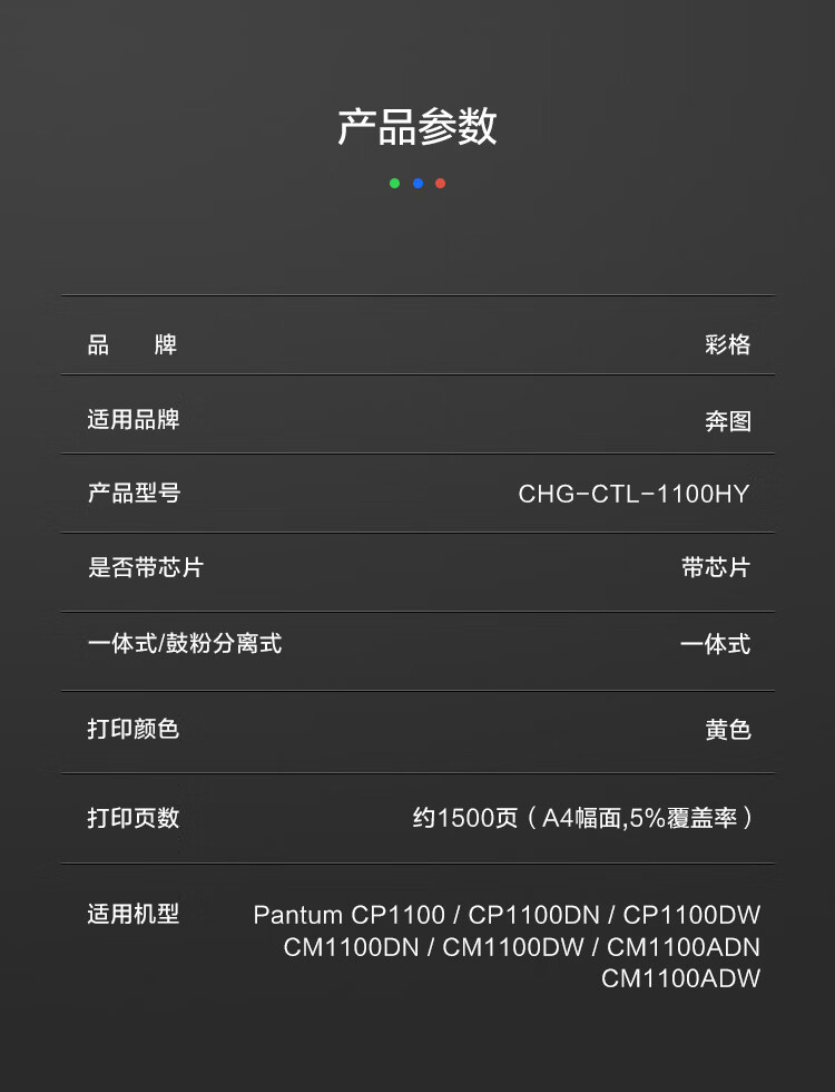 商品属性 [供应商] 德致商成集团有限公司 [打印页数] 1500页 [是否可加粉] 不可加粉 [原装/通用] 通用耗材 [包装清单] 黄色硒鼓大容量(1支) [类别] 一体式硒鼓 [适用机型] 适用奔图CP1100/DN/DW/CM1100DN/DW/ADN/ADW/CP1105