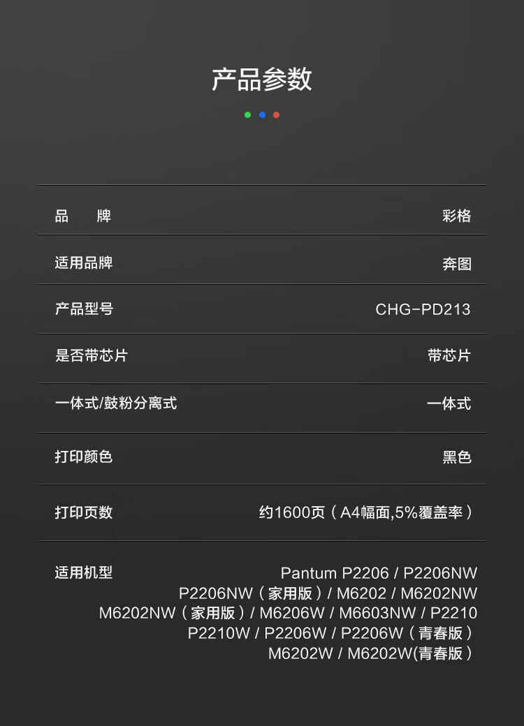 商品属性 [供应商] 德致商成集团有限公司 [打印页数] 1600页 [是否可加粉] 不可加粉 [原装/通用] 通用耗材 [包装清单] 黑色硒鼓(1支) [类别] 一体式硒鼓 [适用机型] 适用奔图p2206nwp2206wm6202w
