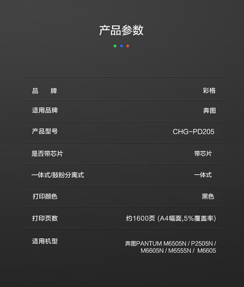 商品属性 [供应商] 德致商成集团有限公司 [打印页数] 1600页 [是否可加粉] 不可加粉 [原装/通用] 通用耗材 [包装清单] 黑色硒鼓(1支) [类别] 一体式硒鼓 [适用机型] 用奔图PANTUMP2505M6505M6555M6605P2550系列打印机