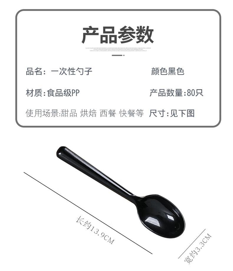 商品属性 [供应商] 得力集团有限公司 [品牌] 芳草地 [型号] 3G5389 [商品标题] 芳草地 一次性勺子80支 长柄勺子小调羹汤勺快餐甜品咖啡黑色勺 独立包装 [销售单位] 包