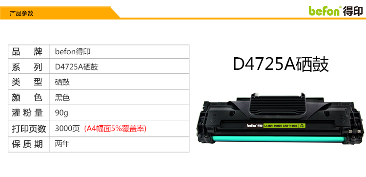 商品属性 [供应商] 深圳市云中鹤科技股份有限公司 [品牌名称:] 得印(befon) [商品型号:] SCX-D4725A [商品sku编码:] 1125899907304742 [重量:] 1.07kg [产地:] 中国大陆 [单位:] 支