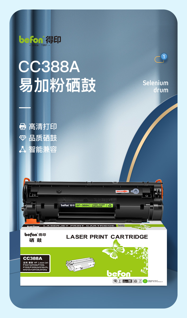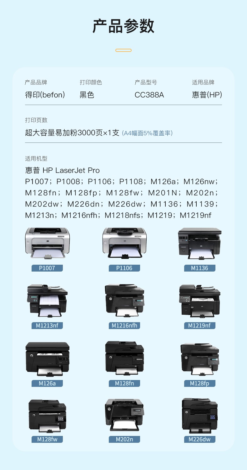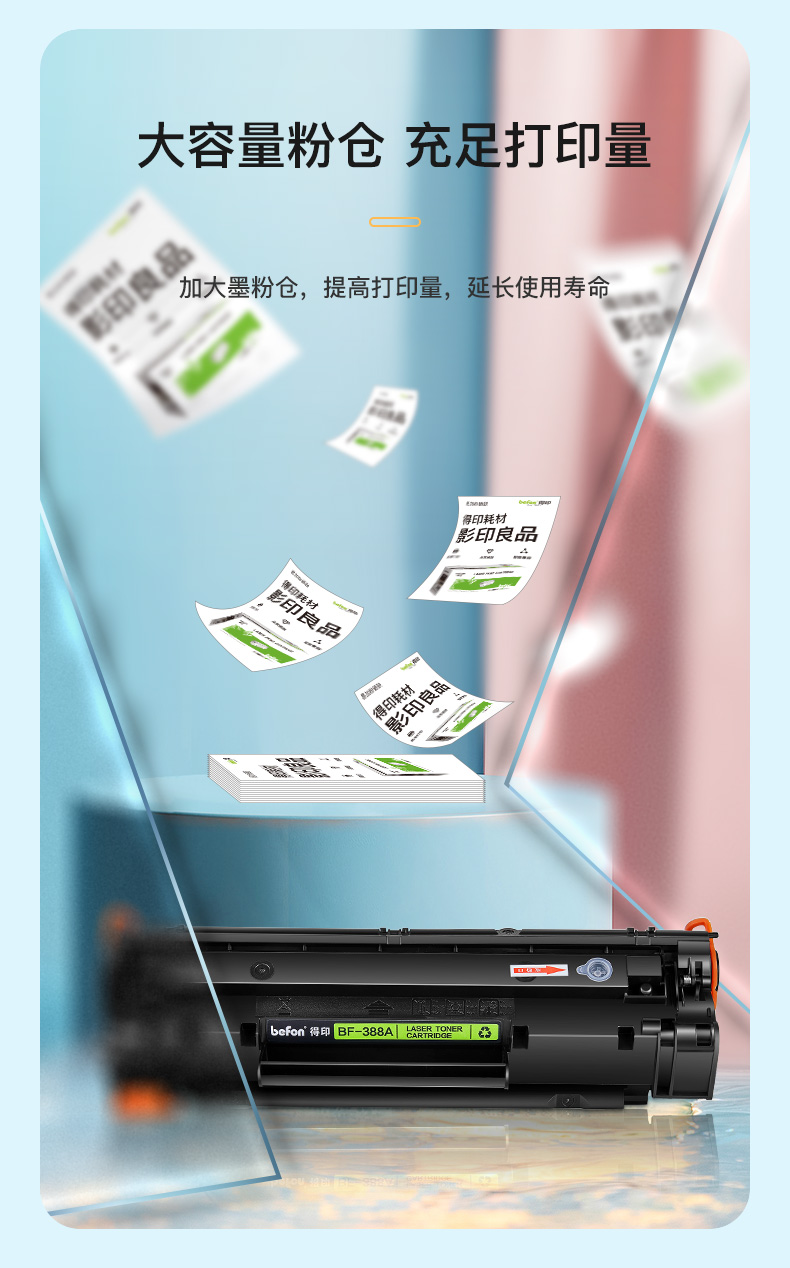 商品属性 [供应商] 深圳市怡亚通供应链股份有限公司 [品牌:] 得印(befon) [型号:] CC388A [规格:] 易加粉 大容量 3000页