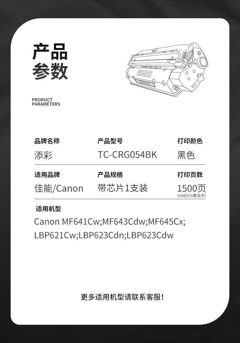 商品属性 [供应商] 德致商成集团有限公司 [打印页数] 1500页 [打印量] 1500页 [原装/通用] 通用耗材 [包装清单] 粉盒x1,产品说明书x1 [类别] 粉盒/粉仓 [适用机型] 佳能MF641Cw MF643Cdw MF645Cx LBP621Cw LBP623Cdn/Cdw
