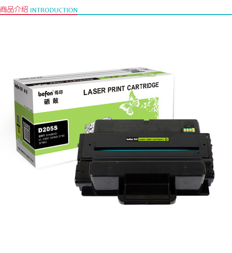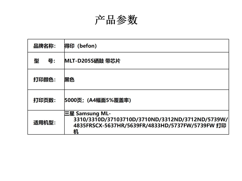 商品属性 [供应商] 科力普科技集团股份有限公司 [打印量] 5000页 [适用机型] 三星Samsung ML- 3310/3310D/37103710D/3710ND/3312ND/3712ND/5739W/ 4835FRSCX-5637HR/5639FR/4833HD/5737FW/5739FW打印机 [商品毛重] 1507克 [品牌] 得印 [型号] MLT-D205S