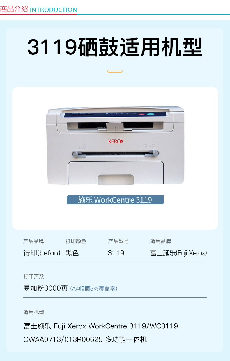 商品属性 [供应商] 科力普科技集团股份有限公司 [适用机型] 富士施乐 Fuji Xerox WorkCentre 3119/WC3119 CWAA0713/013R00625 多功能一体机 [打印量] 3000页 [商品毛重] 892克 [品牌] 得印
