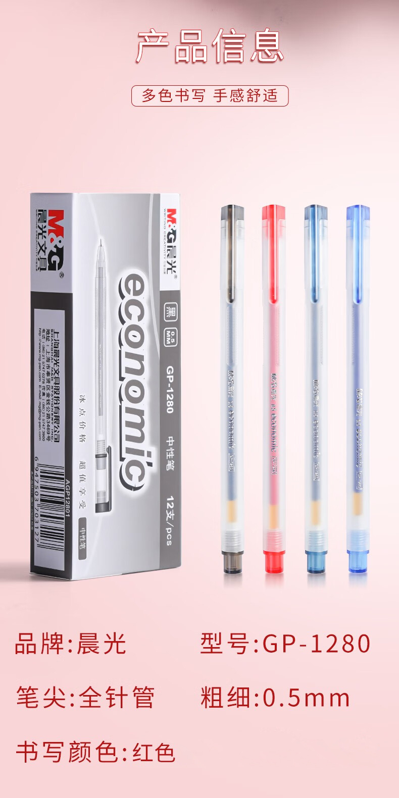 商品属性 [供应商] 科力普科技集团股份有限公司 [适用替芯] 笔芯型号:MG-6139 [笔尖粗细] 0.5mm [笔芯颜色] 红色 [打开方式] 拔帽式 [入数] 1支 [品牌] 晨光 [型号] GP-1280 [内包装] 12支/盒
