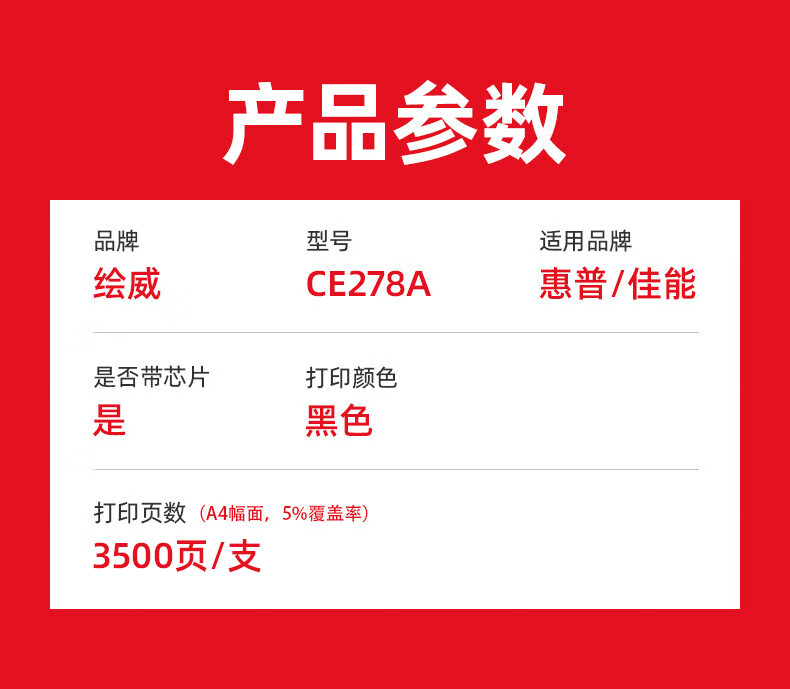 商品属性 [供应商] 深圳市怡亚通供应链股份有限公司 [品牌:] 绘威 [型号:] CE278A [规格:] 大容量 带芯片 打印页数3500页
